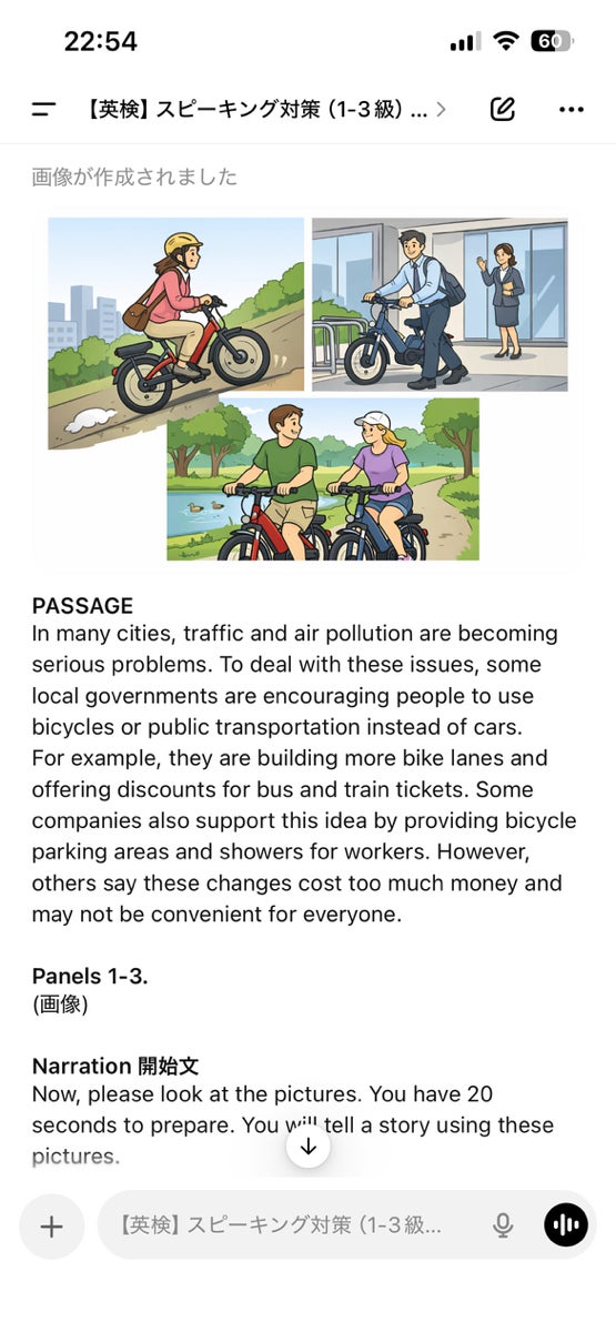準2級プラス:パッセージ音読 → 3コマのナレーション(準備時間あり)→ 意見問題(Opinion)