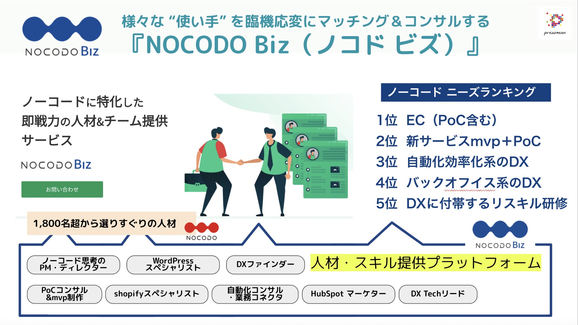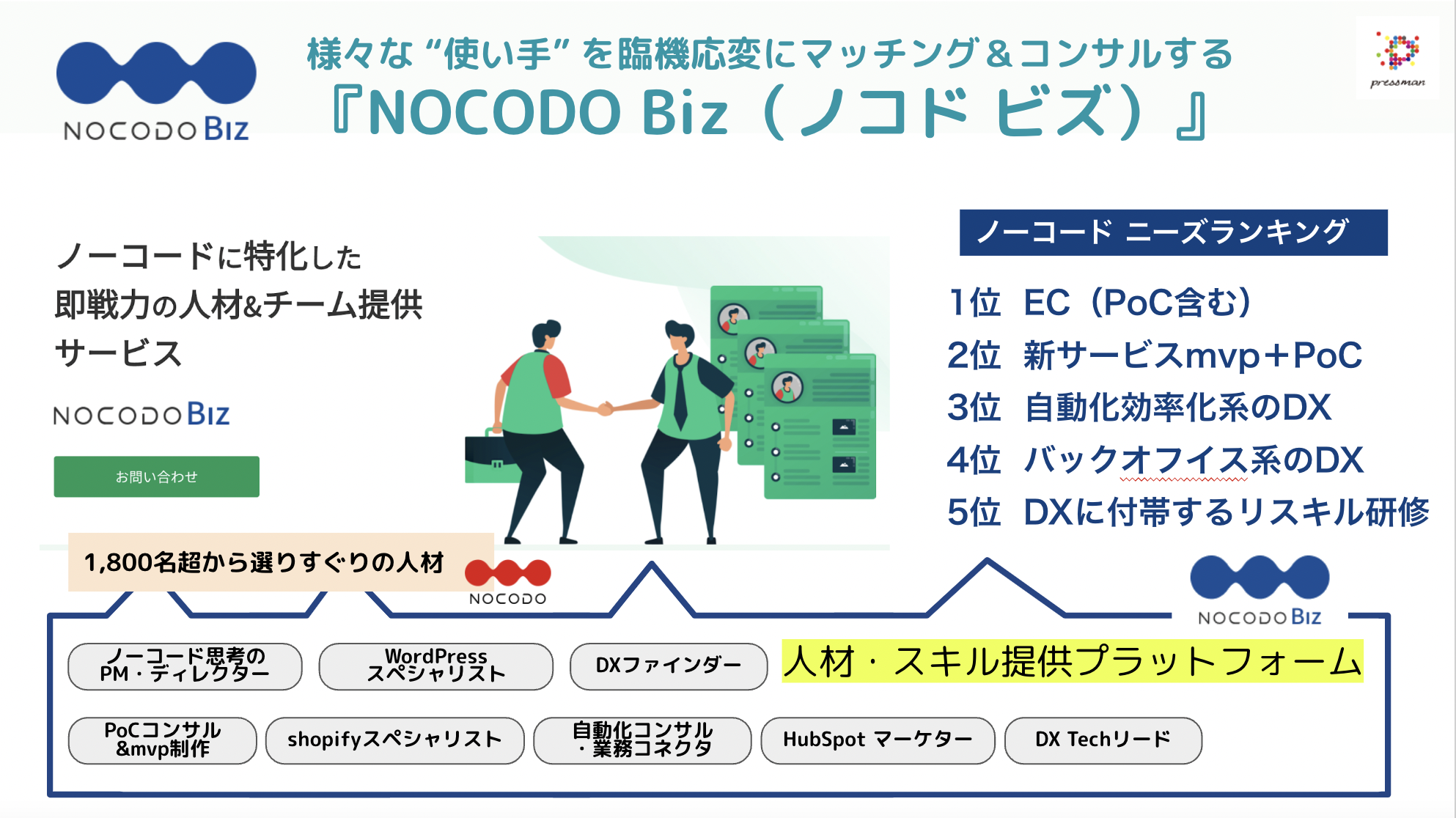 NoCode(ノーコード)/LowCode(ローコード)事業を展開する株式会社プレスマン(本社:東京都区中央区、代表取締役社長:関口茂)は、ノーコード人材が1,800名以上登録するプラットフォーム『NOCODO(ノコド)』の関連サービスとなる「NOCODO Biz(ノコド ビズ)」にて、EC/マーケ/MVP/自動化ソリューションを本格開始いたしました。