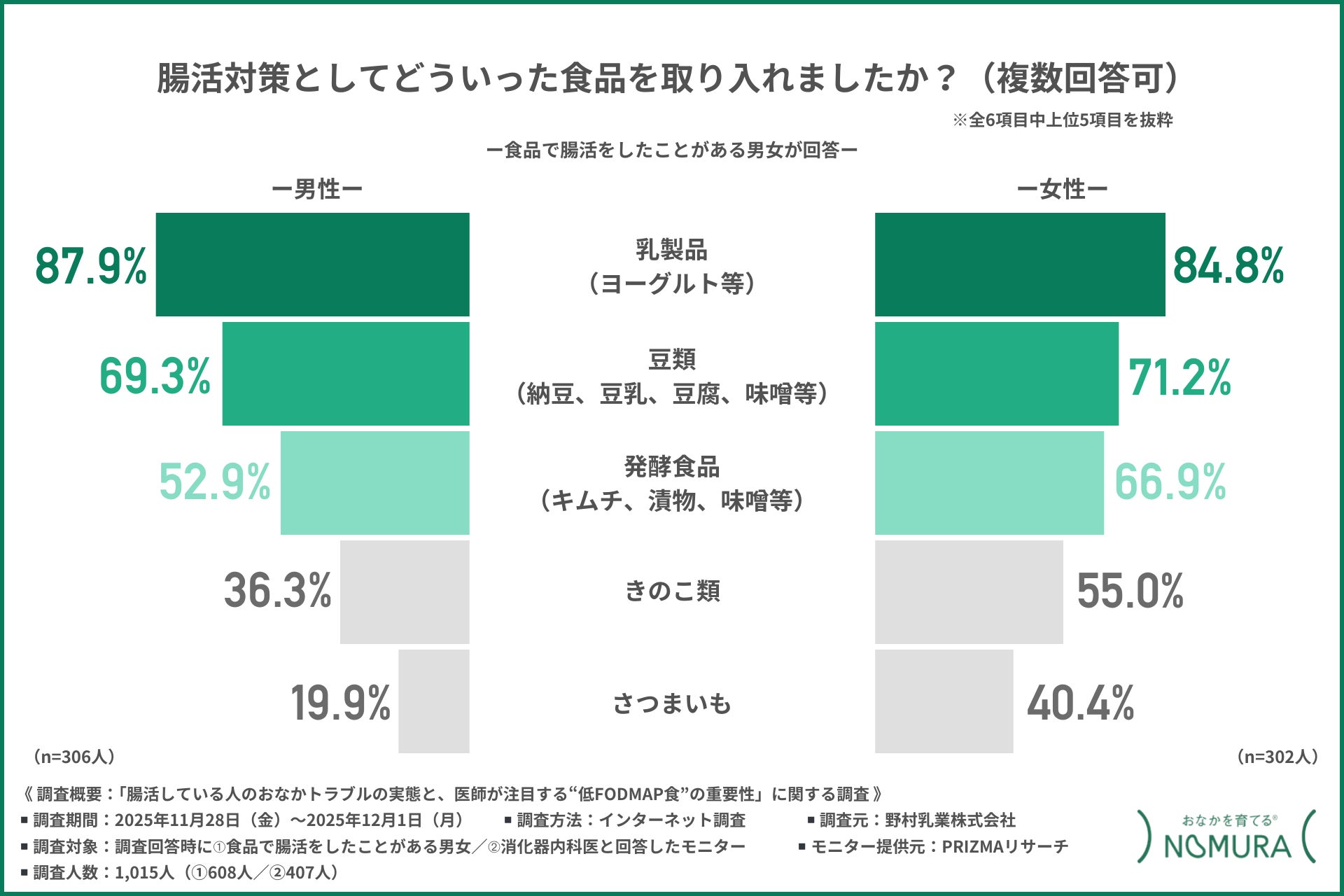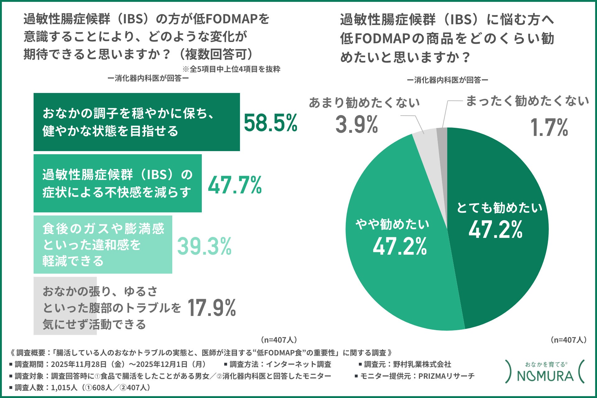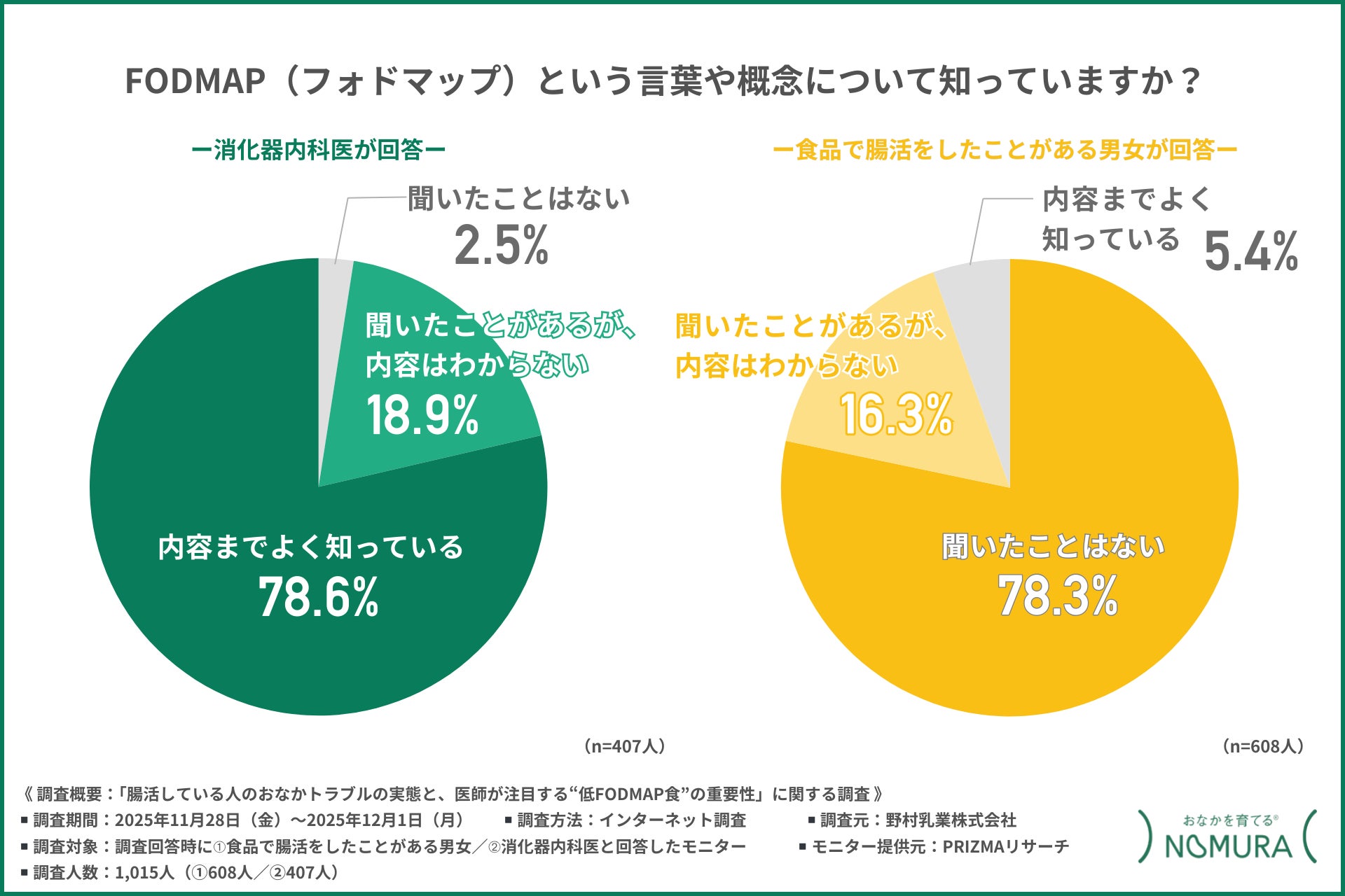 野村乳業株式会社(本社所在地:広島県安芸郡府中町、代表取締役:野村 和弘)は、➀食品で腸活をしたことがある男女/➁消化器内科医を対象に「腸活している人のおなかトラブルの実態と医師が注目する“低FODMAP食”の重要性」に関する調査を行いました。