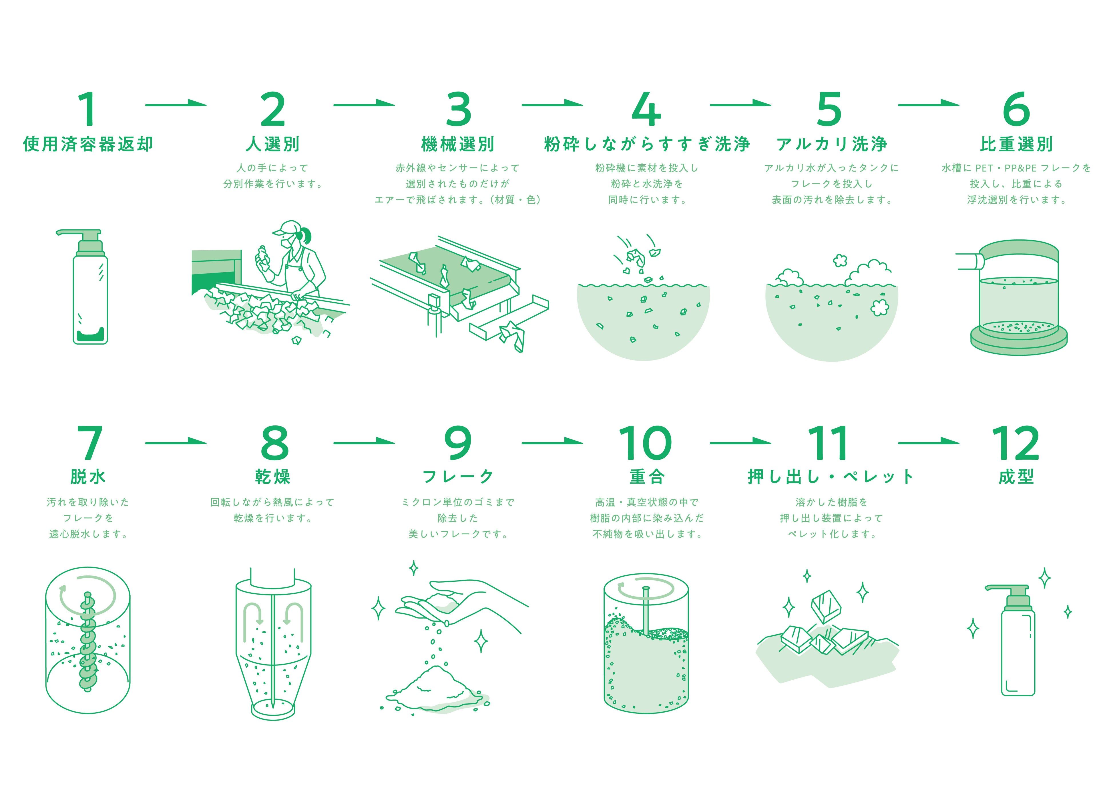 回収済み容器は、再度ボトルに生まれ変わる水平リサイクルとなります。