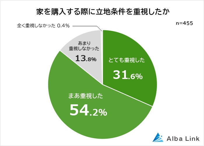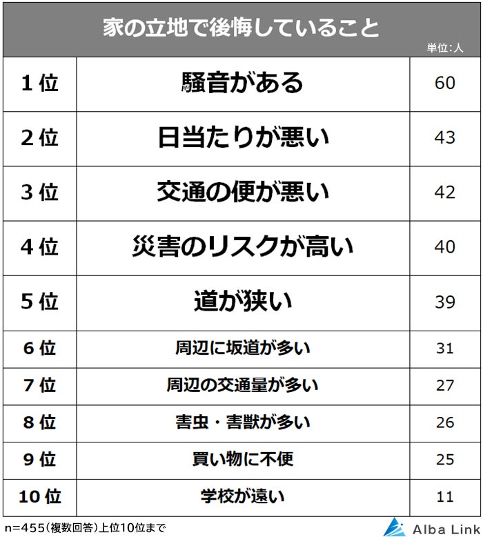 今回、株式会社AlbaLink( https://albalink.co.jp/ )が運営する訳あり物件買取プロ( https://wakearipro.com/ )は、家の購入経験がある455人を対象に「家の立地で後悔していること」についてアンケート調査を実施しました。