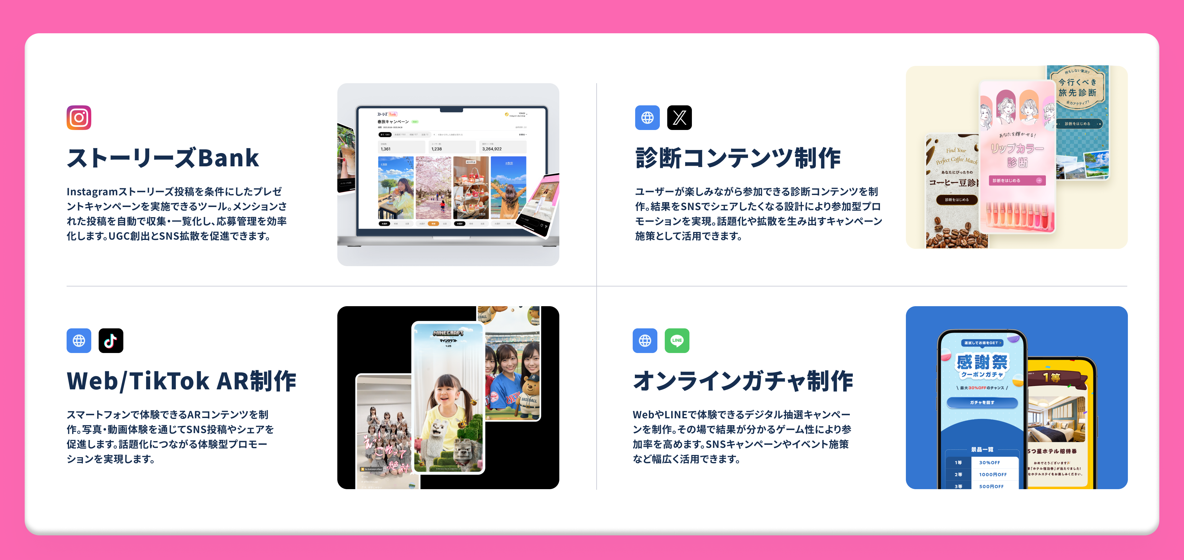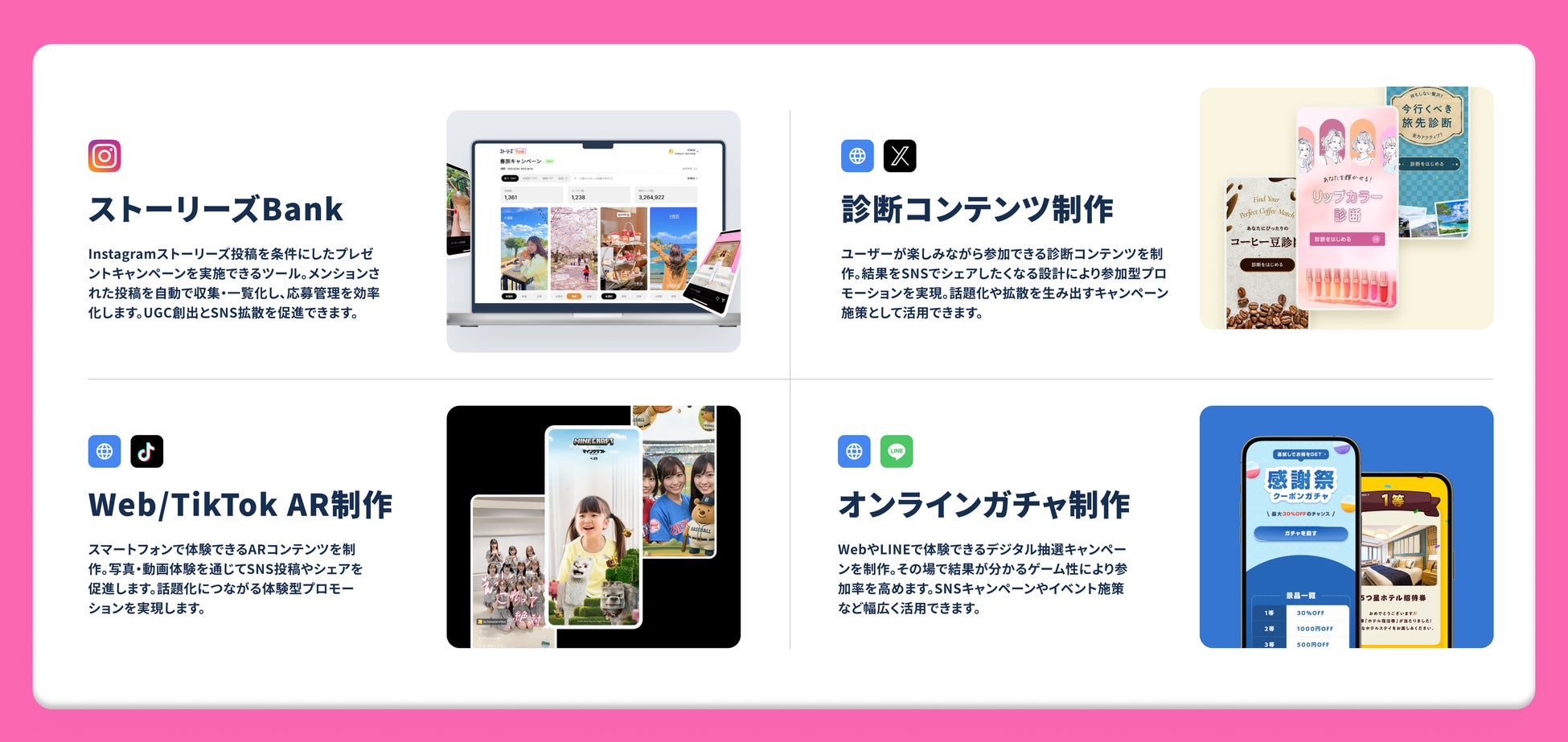 SNSキャンペーン・診断コンテンツ・オンラインガチャ・AR施策を提供し、企画から制作・実行までを一貫支援