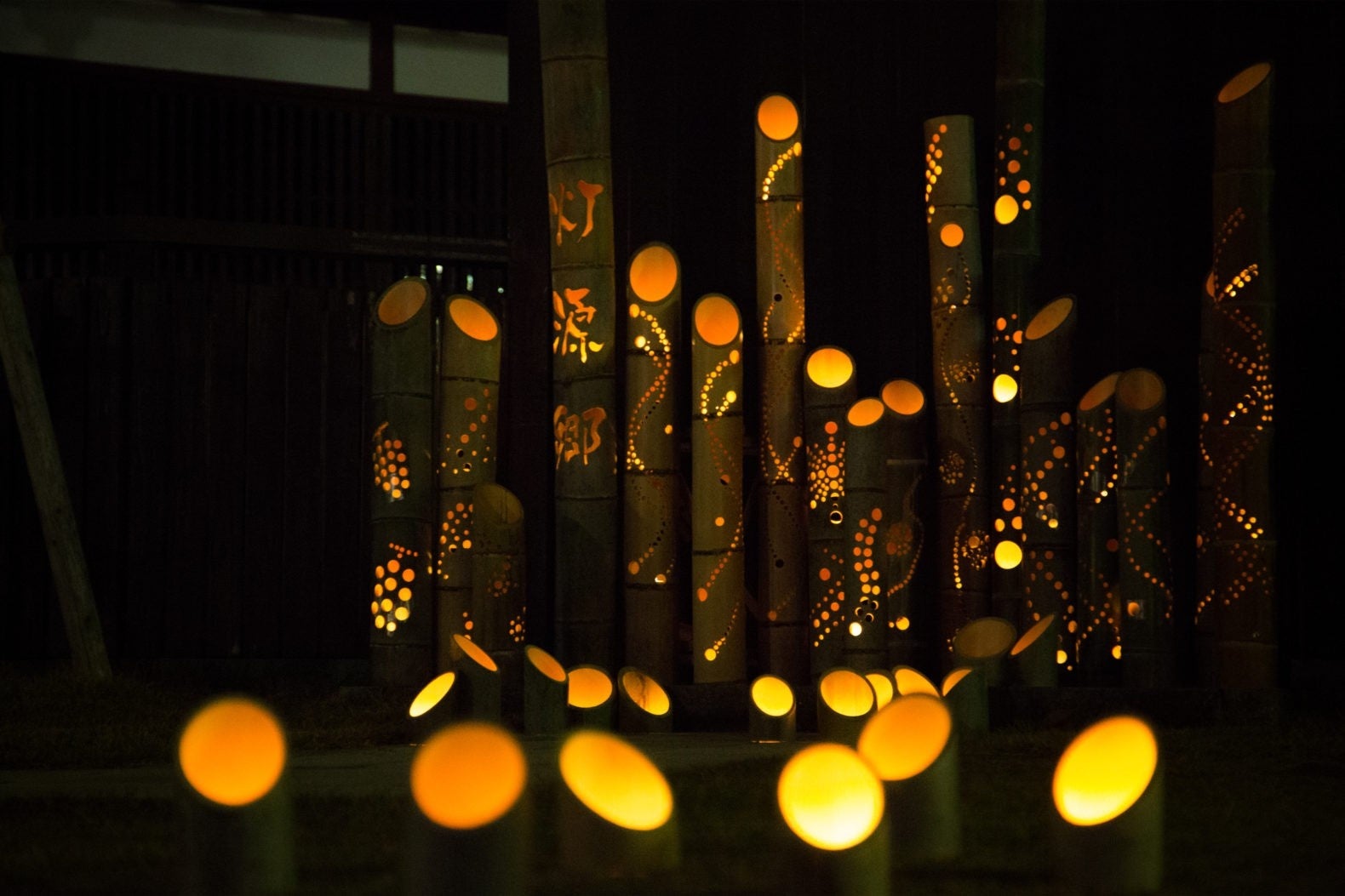 あわら温泉湯のまち広場を、200本の竹灯りと約1,000個の「あかりばやし」で彩ります。
