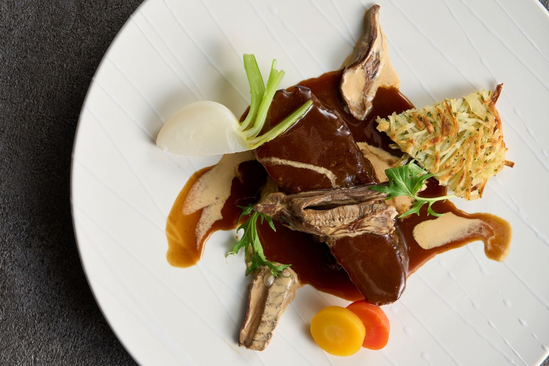 食材の宝庫「千葉」ならではの伊勢海老やサザエ、金目鯛、ハマグリなど選び抜いた食材をフレンチテイストに仕上げた洋会席コース。メインの特選牛ほほ肉のラグーは、牛肉の希少部位を赤ワインと香味野菜で一日漬け込み、たっぷりと5時間煮込んで仕上げています。歴史あるスイスの食文化を取り入れたシェフ渾身の煮込み料理です。静かな上質空間で、素材のよさが生かされた一品一品をゆっくりとお召し上がりいただけます。