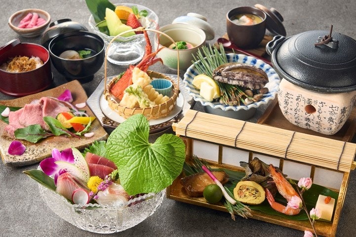 お食事は、アワビや伊勢海老、地元農家さんの新鮮野菜など房総の幸にこだわった人気の「和会席コース」に加え、4月から提供を開始した、伊勢海老やサザエ、金目鯛、ハマグリなど選び抜いた食材をフレンチテイストに仕上げた「洋会席コース」もお選びいただけます。