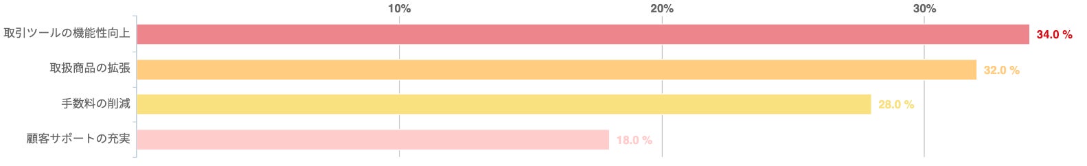 アンケートによれば、「取引ツールの更なる機能性向上」を求めている人が34.0%で最も多い結果となった。主に「入金が即時反映されない」「システムの安定性を強化してサーバーダウンしないようにしてほしい」といった意見が取り上げられた。