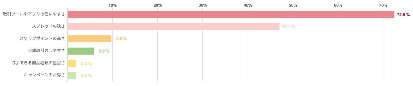 アンケートによれば、「取引ツールやアプリの使いやすさ」を挙げた投資家が72.5%と圧倒的に多く、FX取引初心者でも使いやすいアプリの操作性や機能性の高さが評価されているといえる。