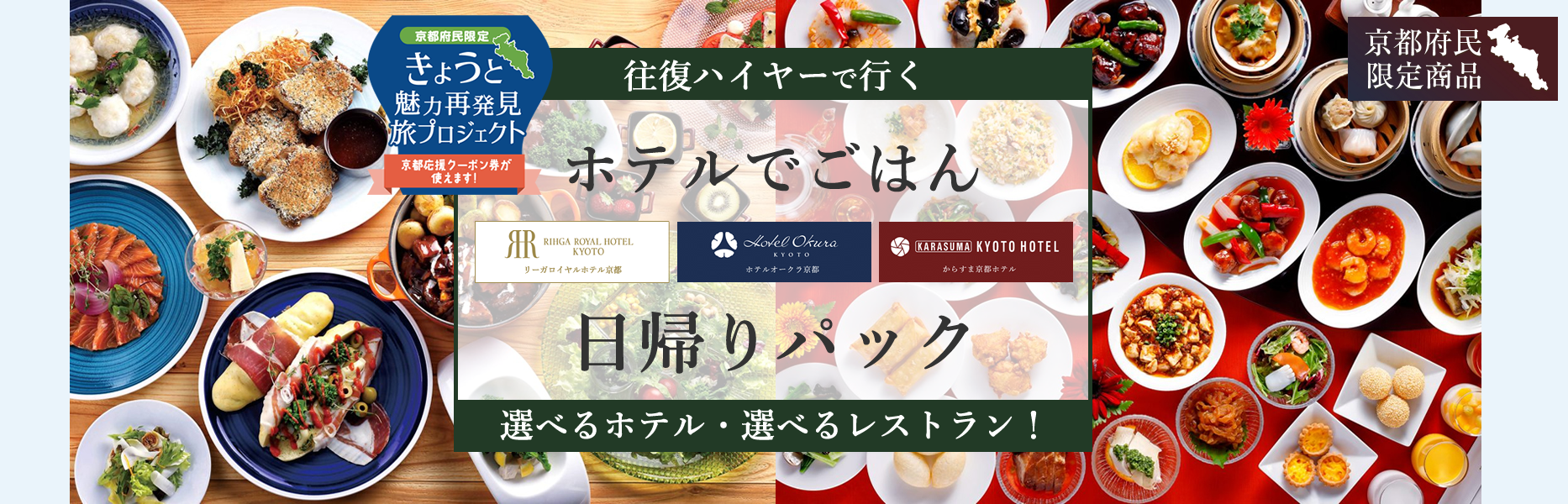 リーガロイヤルホテル京都・ホテルオークラ京都・からすま京都ホテルのレストランストランから選べるコース。往復ハイヤーとお食事がセットになった、お得にお食事が楽しめます。4/28迄の為お早目のご予約を
