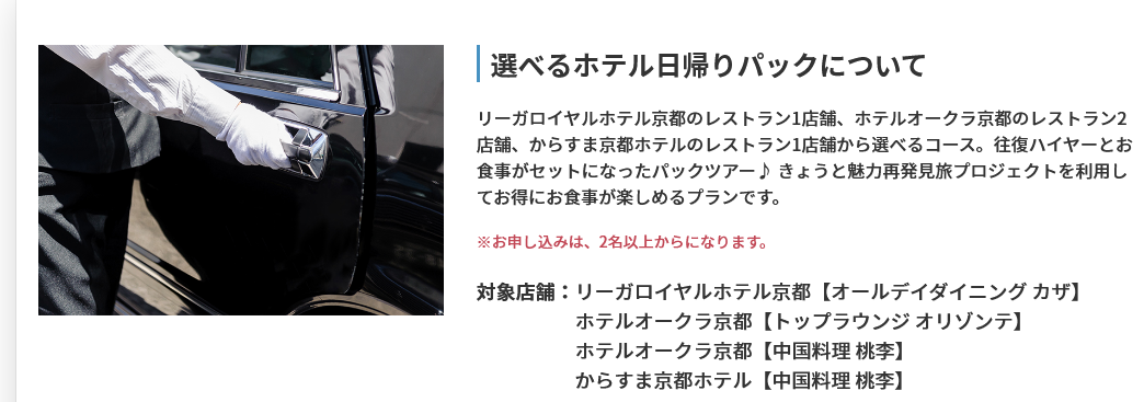 株式会社フォーティーズ(本社:大阪市鶴見区、代表取締役 岡武史)は4月28日迄延長になった「きょうと魅力再発見旅プロジェクト」の対象商品としてリーガロイヤルホテル京都・ホテルオークラ京都・からすま京都ホテルのレストランと往復ハイヤーがセットになったパックツアーのオンライン販売を開始いたしました。