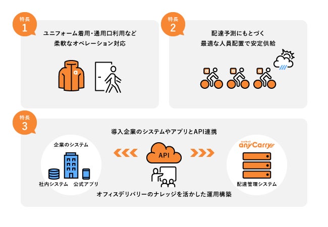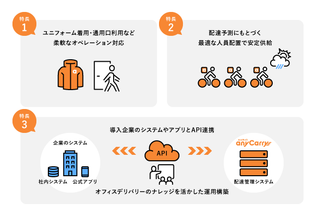 導入企業のシステムやアプリとのAPI連携が可能で、注文から配達完了までスムーズな情報連携を実現します。また当社ソリューション担当者がこれまでのオフィスデリバリーのナレッジを活かして運用構築を行なうため、自社デリバリーの課題解決に貢献します。
