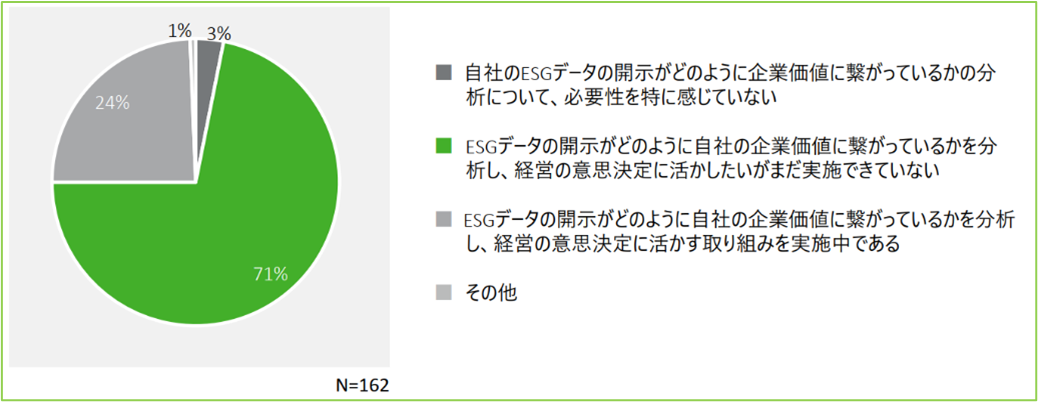 デロイトトーマツグループの調査によると、7割超の企業が「ESGデータの開示がどのように自社の企業価値に繋がっているかを分析し経営の意思決定に活かしたいがまだ実施できていない」と回答しており、「サステナビリティ情報を開示したとしても、それをサステナビリティ経営や企業価値向上に活かしきれていない」という実態が見受けられます。