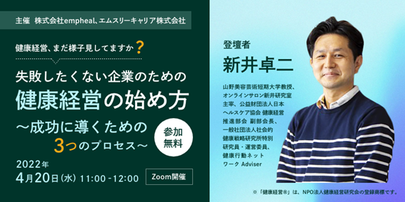 【4/20(水)11:00~12:00無料ウェビナー 新井卓二氏登壇!】健康経営、まだ様子見していますか?失敗したくない企業の健康経営の始め方