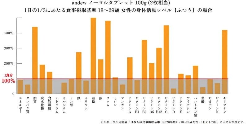 下表は、andew ( 1枚50g )2枚に含有している各栄養素の成人男性の1日の基準量に対する割合を示したものです。