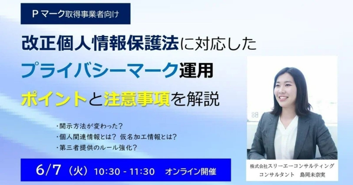 【Pマーク取得事業者向けウェビナー】改正個人情報保護法に対応したプライバシーマーク運用のポイントと注意事項を解説!6/7(火)10:30~無料