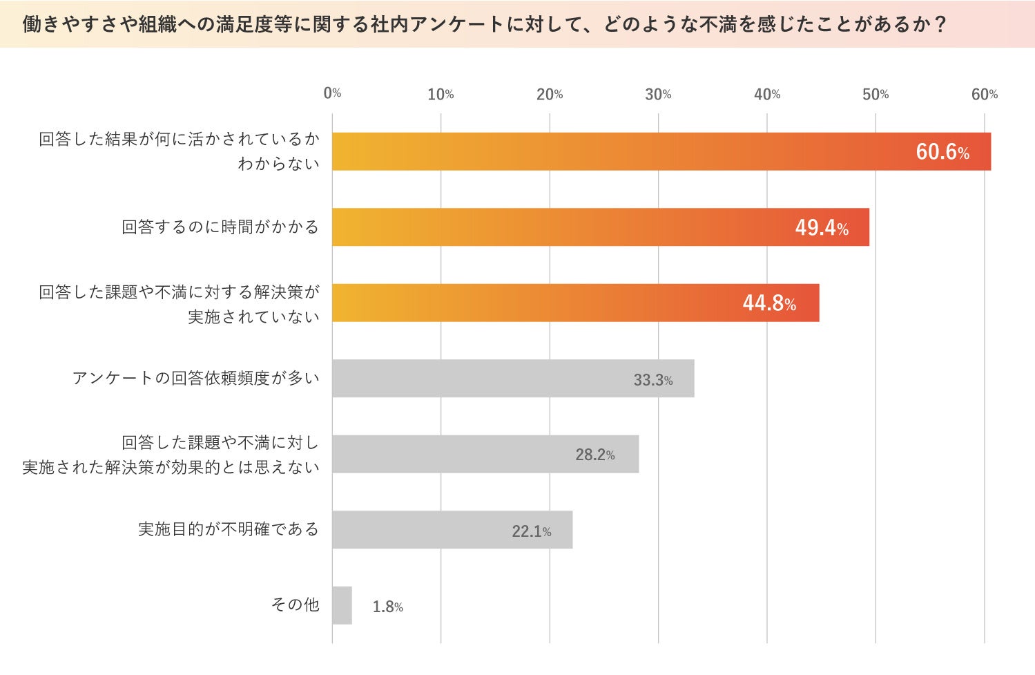 エンゲージメントサーベイツールを定期的に利用・回答した経験があり、かつ不満を感じたことがある会社員330名を対象に、「働きやすさや組織への満足度等に関する社内アンケートに対して、どのような不満を感じたことがありますか?(複数回答可)」という質問を行ったところ、もっとも多く回答されたのが「回答した結果が何に活かされているかわからない」で、60.6%となりました。