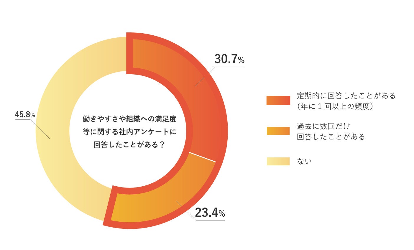 会社員2,200名に対し、「今までに働いた会社や組織で、働きやすさや組織への満足度等に関する社内アンケートに回答したことがあるか」という質問を行ったところ、30.7%が「定期的に回答したことがある」、23.4%が「過去に数回だけ回答したことがある」と回答しました。54.1%の人が、エンゲージメントサーベイツールへの回答経験を持つという結果になりました。