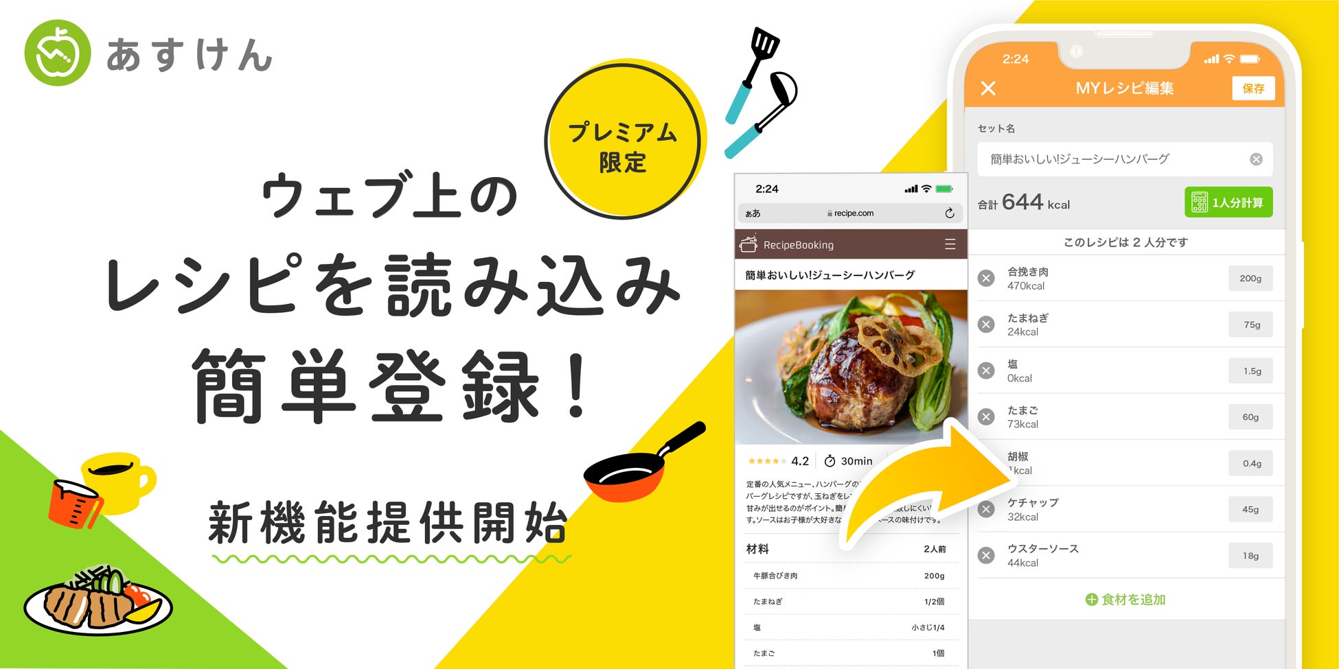 株式会社asken(東京都新宿区、代表取締役社長 中島洋、以下「当社」)は、開発・運営を行う国内売上No.1*¹のAI食事管理アプリ『あすけん』の食事記録の際に、Webサイト上のレシピを読み込んで登録できる新しい機能を、あすけんプレミアムサービス*²の一部として提供を開始いたしましたのでお知らせいたします。本機能により、これまで、Webサイト上に記載されている材料・分量を一つ一つ手入力する必要があった自炊料理の登録の手間を軽減することができます。
