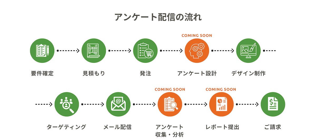 特徴: アンケートの設問設計、メール配信、アンケート収集・分析、レポートをまとめてサポート