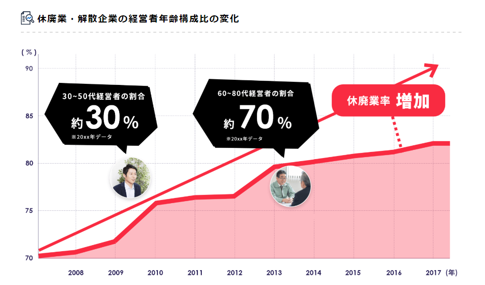 2025年までに、70歳(平均引退年齢)を超える中小企業・小規模事業者の経営者は約245万人となり、その約半数の127万(日本企業全体の1/3)が後継者未定。