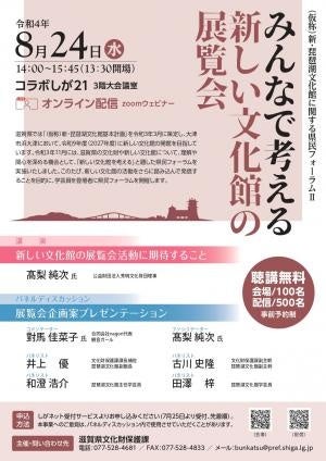 滋賀県は、2027年開館予定の「(仮称)新・琵琶湖文化館」をテーマにした記念フォーラム「みんなで考える 新しい文化館の展覧会」を2022年8月24日(水)、コラボしが21(大津市打出浜)にて開催します。