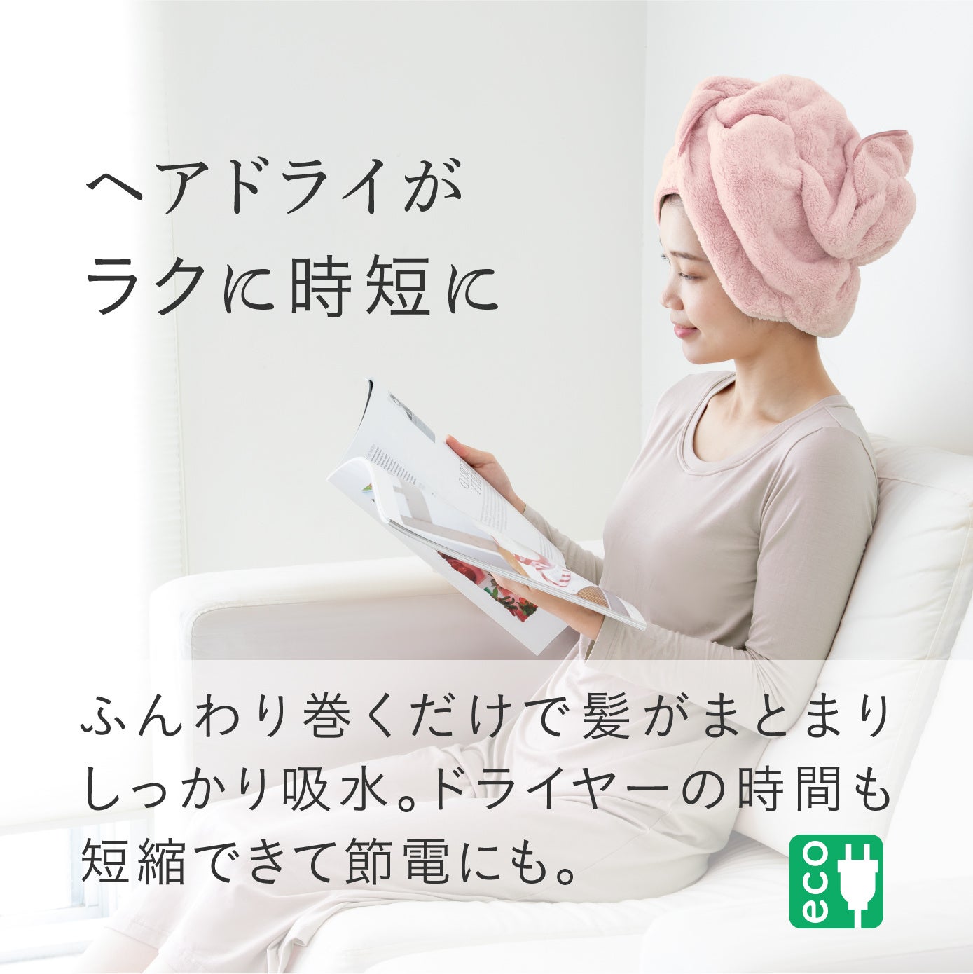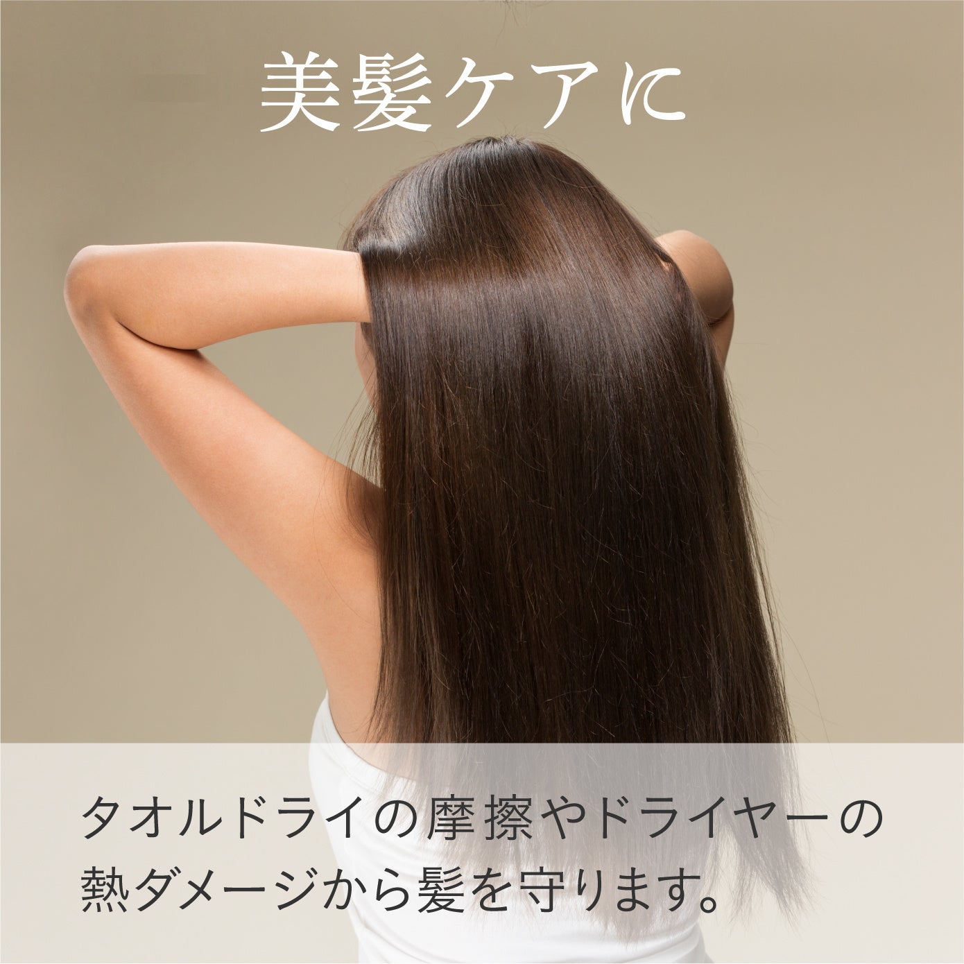 超吸水タオルで巻くだけで吸水。ドライヤーの使用時間を短縮でき、摩擦やドライヤーの熱ダメージから髪を守ります。ロングサイズでループ着きで乾かしやすくタオルとしても身体の水滴の吸収が出来て快適に過ごせます。