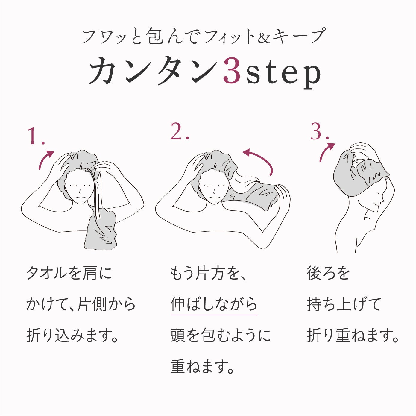 ふんわりとした触り心地の毛足の長い極細マイクロファイバーとゴム糸を入れ伸縮性を持たせることでタオルが頭に巻き付きしっかりとまとめられて水分の吸収出来ます。