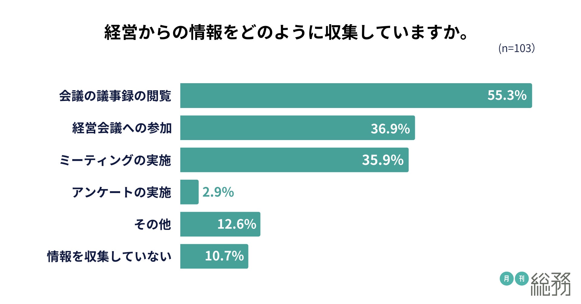 経営からの情報をどのように収集しているかについては、「会議の議事録の閲覧」が55.3%と最も多く、「経営会議への参加」が36.9%、「ミーティングの実施」が35.9%と続きました(n=103)。