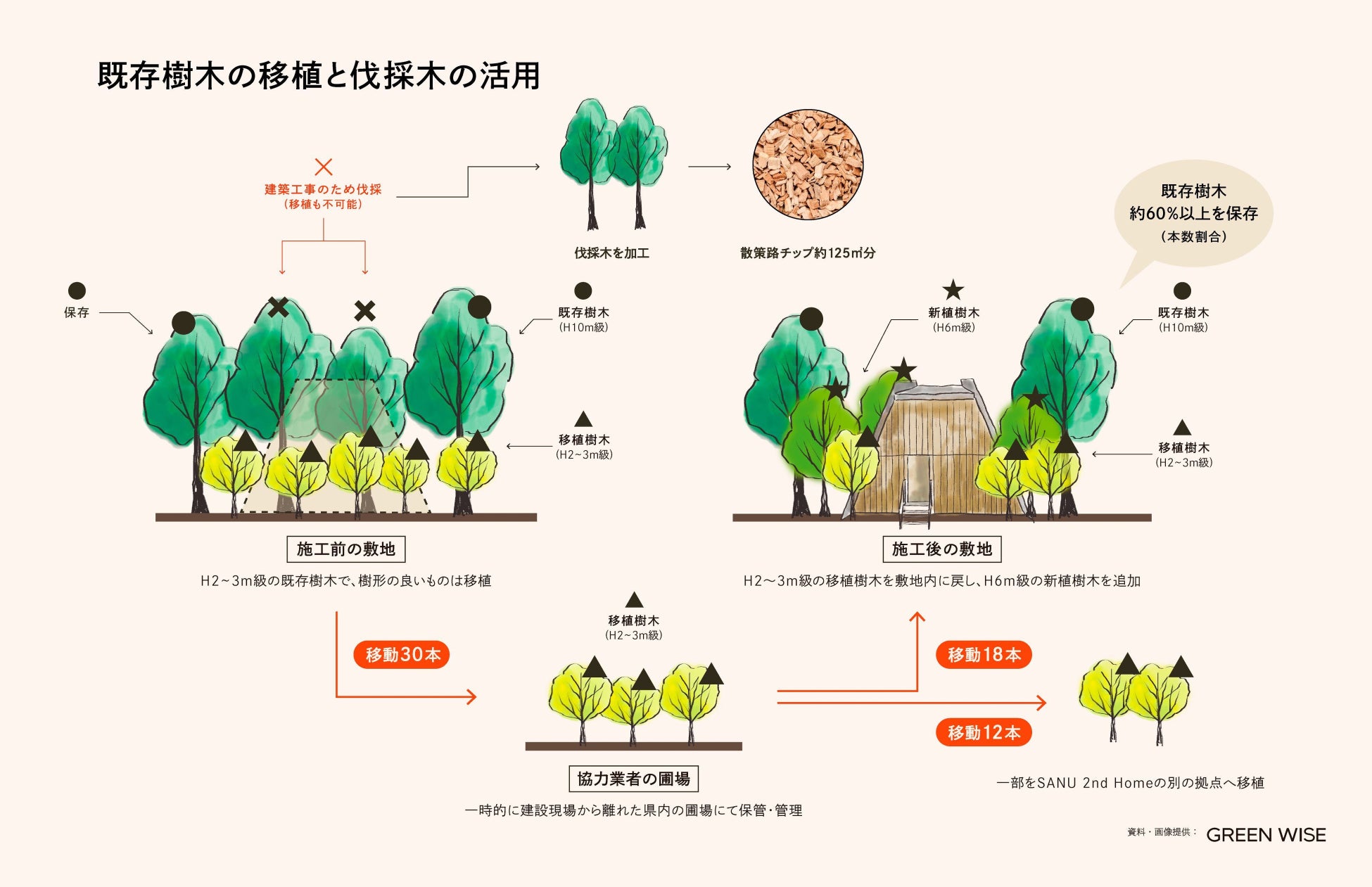 SANUは、これまでに建築〜運用〜解体の一連の流れでカーボンネガティブの実現を目指し取り組んでいますが、この度の新拠点では、協業先である株式会社グリーン・ワイズ並びに株式会社ADXと共に土地開発におけるネイチャーポジティブ(*)を意識し開発を進めました。答えのないクリエイティブな土地開発のため、ディスカッションや現場での試行錯誤を重ねながら、できるだけ拠点内の既存の樹木や自然を残し、計画上やむなく伐採することになった樹木についても極力資源として活用するなど、循環を意識した取り組みを実践しています。