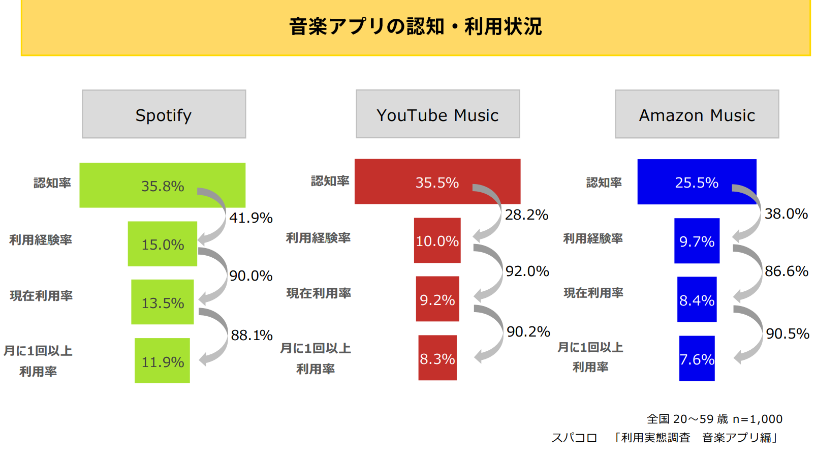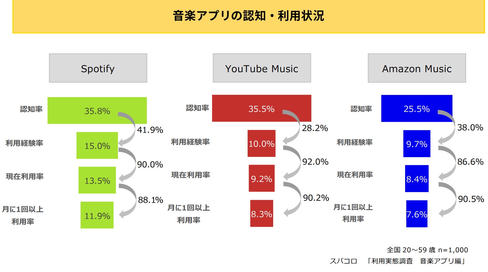 全国の20~59歳の1,000人に聞いた音楽アプリの浸透状況についてみてみると、認知率上位3アプリはSpotify、YouTube Music、Amazon Musicという結果に。