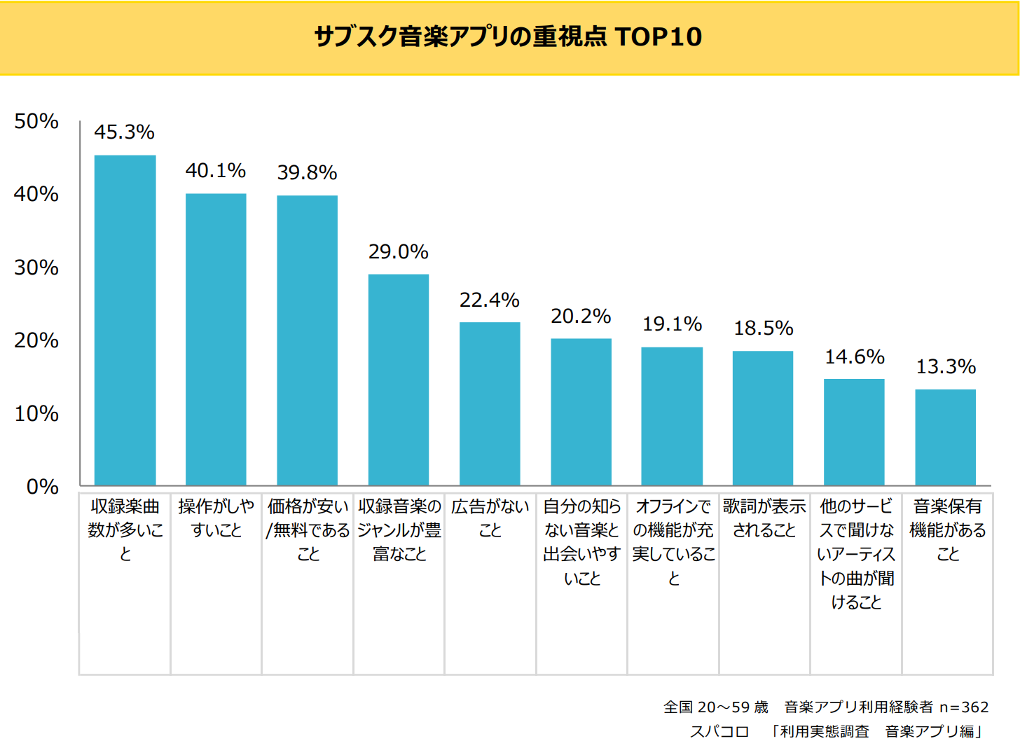 音楽アプリの重視点は、上位から「収録楽曲数が多いこと」45.3%、「操作がしやすいこと」40.1%、「価格が安い/無料であること」39.8%、「収録音楽のジャンルが豊富なこと」29.0%という結果に。