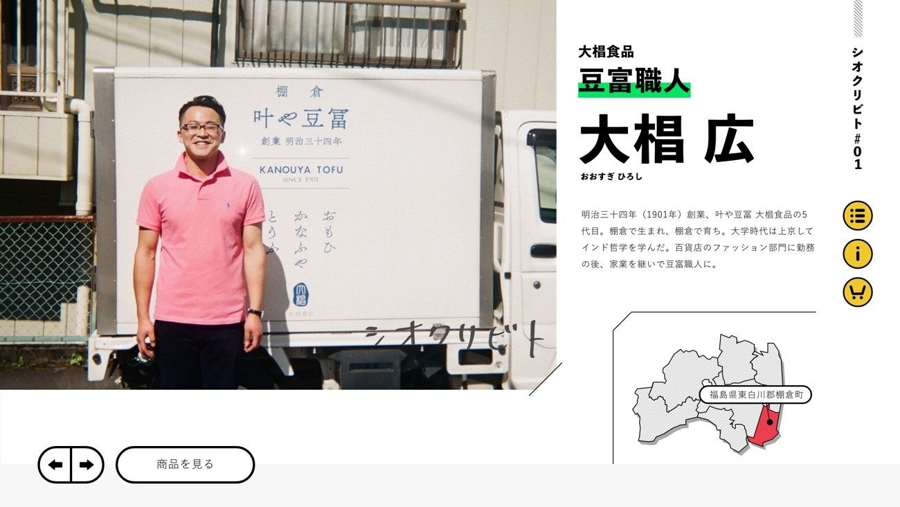 「シオクリビト」は、便利にモノを買える通販でなく、顔の見えるあの人から品物が届くような体温を感じる通販です。総勢80名の福島の生産者たちの幼少期の思い出や青春時代など、一人当たり20ほどあるエピソードを見ることなしに、商品ページにたどり着けない情緒的ECです。2022年グッドデザイン賞受賞。