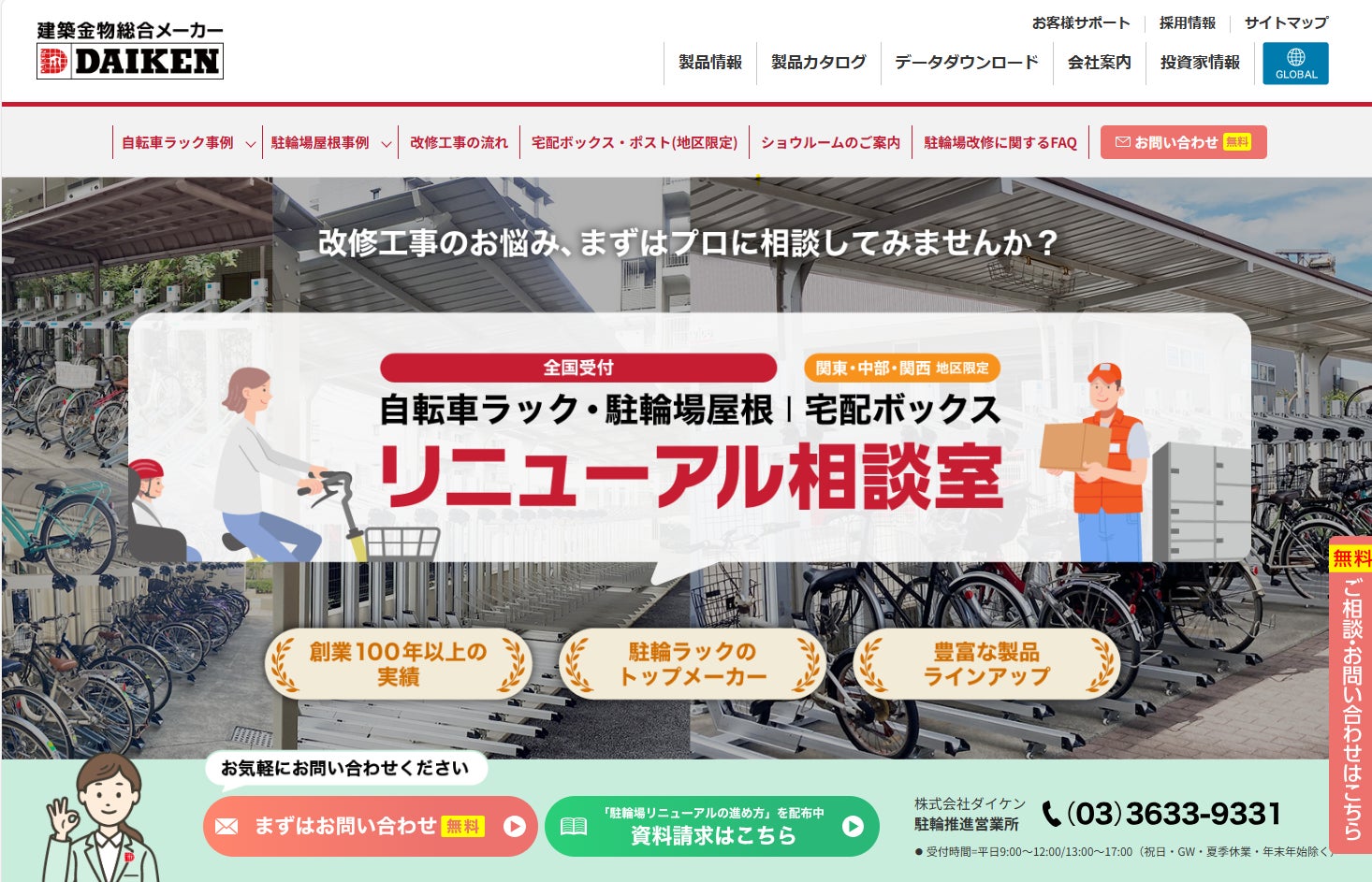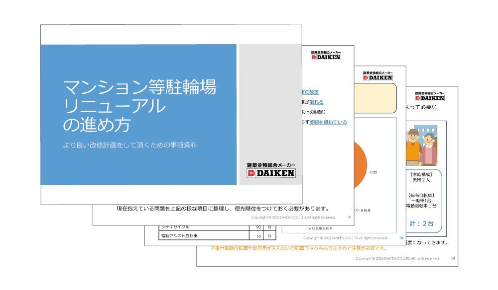 建築金物・外装用建材・エクステリアなどの総合メーカー、株式会社ダイケン(本社:大阪市淀川区 社長:藤岡洋一)は、集合住宅や店舗、各種施設における駐輪場改修工事をご検討中のお客様を対象に、当社ウェブサイト内の改修工事受付ページ『リニューアル相談室』を全面的に刷新いたしました。