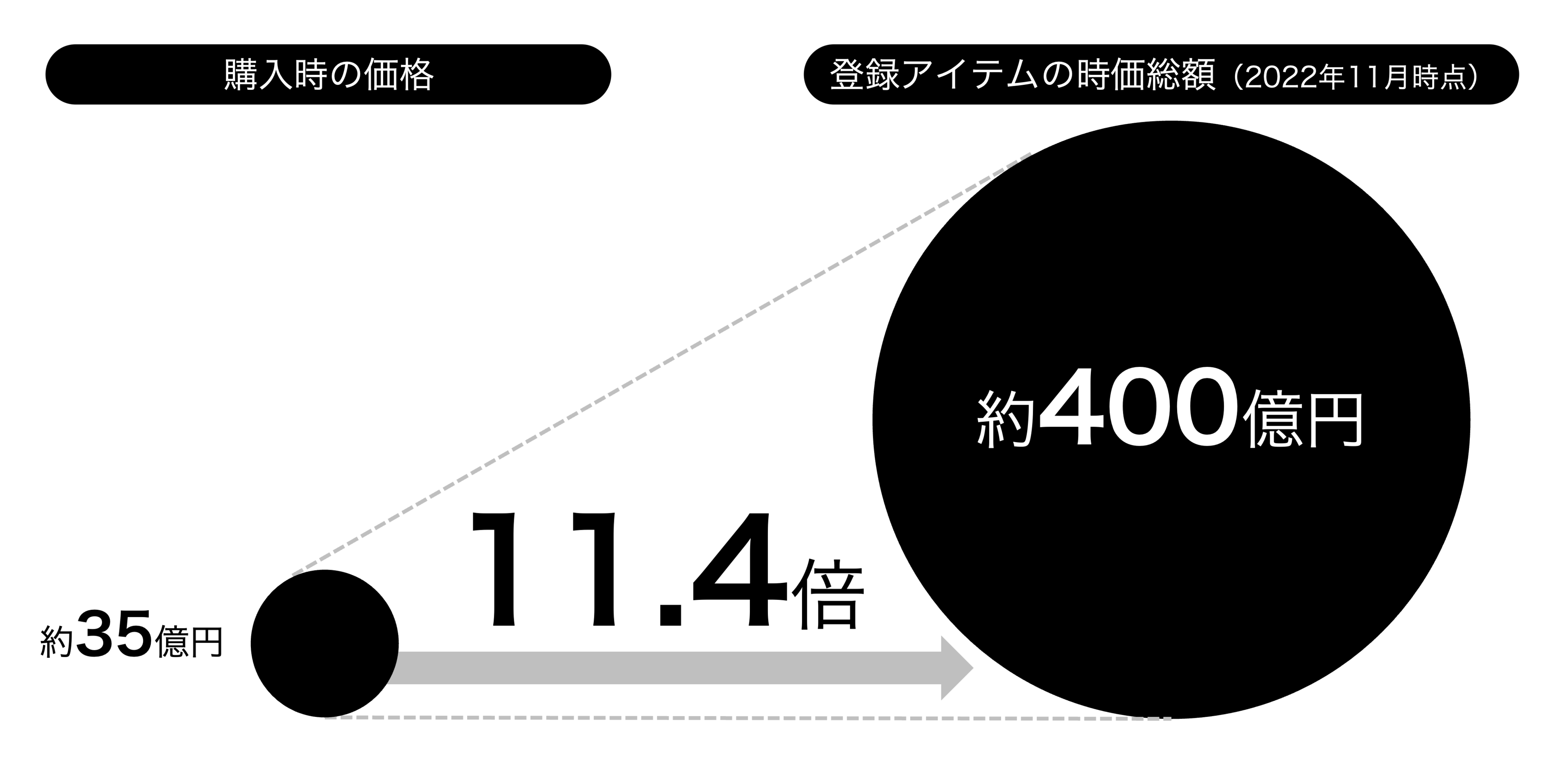 また「COLLET」の特長のひとつとして、世界中で行われているオークションデータを独自に解析することで最新の参考市場価格を可視化できる機能を設けています。この機能を通じて登録アイテムの時価総額を算出したところ、お客様が購入された当時の価格と比較し、実に11.4倍にもなる400億円相当(※)にまで価値が向上していることが明らかになりました。
