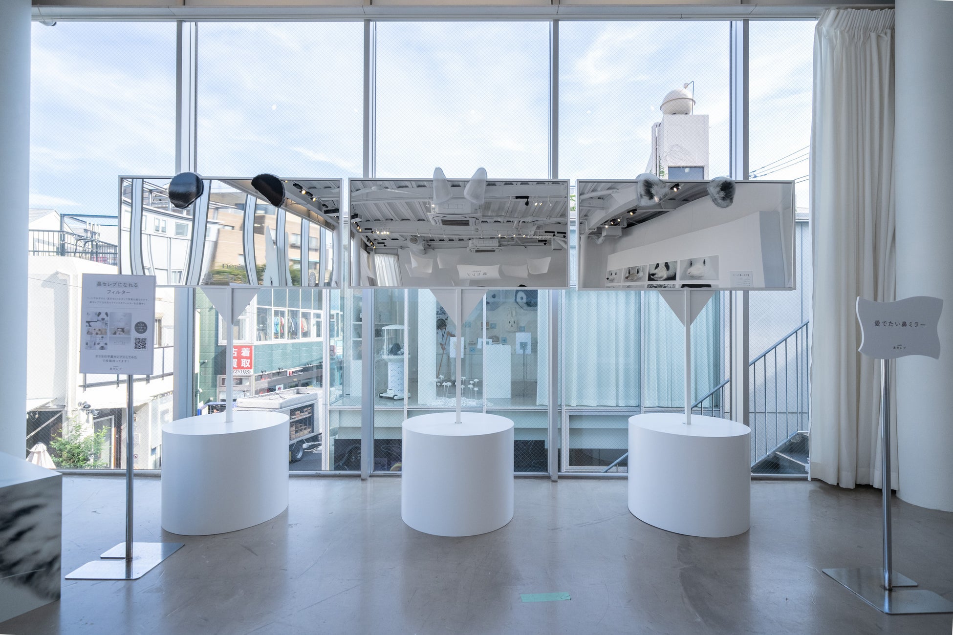 鏡の中央にさまざまな動物の鼻が映ったミラースタンドのエリア。鼻セレブのパッケージの動物たちになりきって写真撮影!