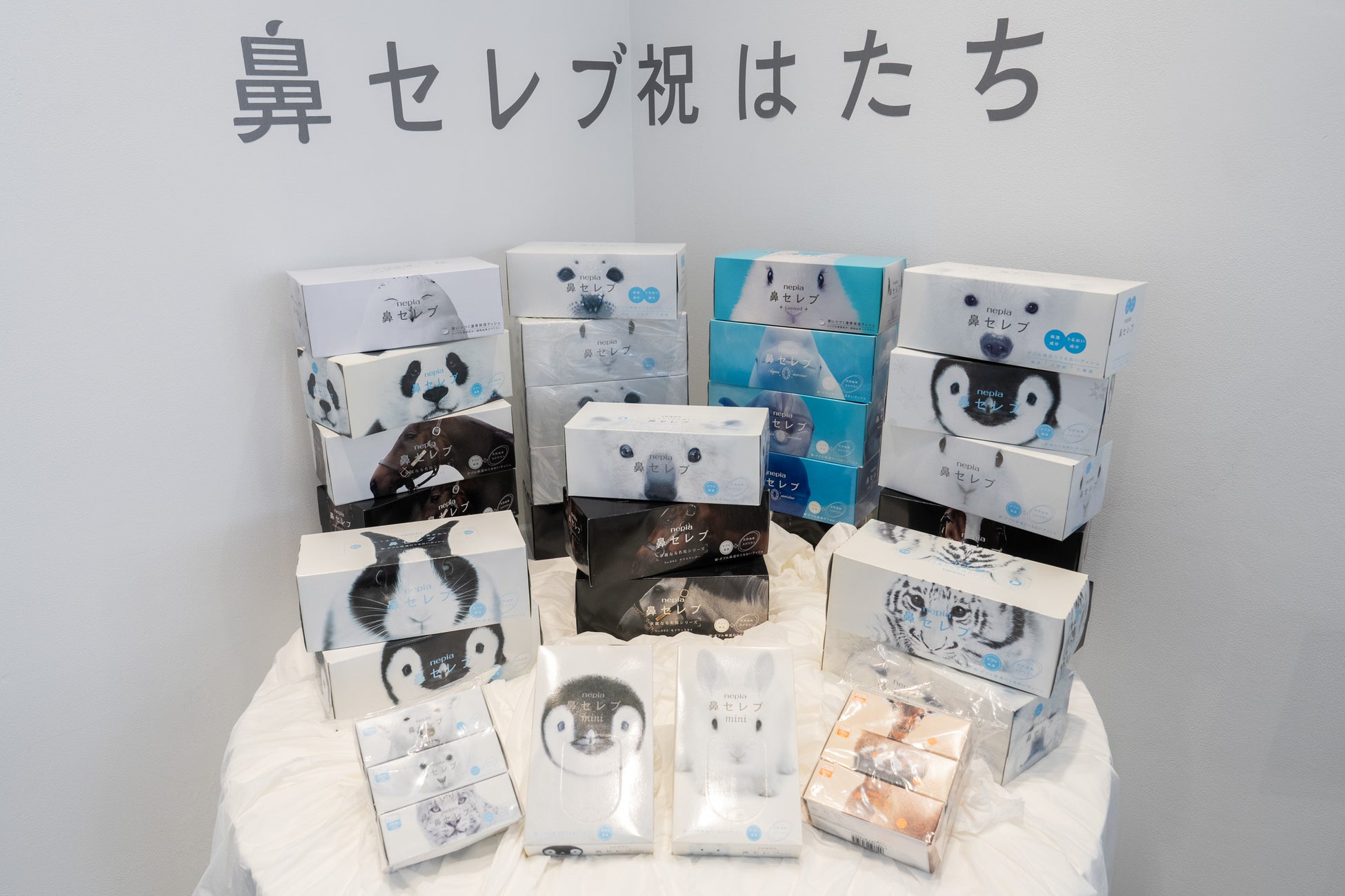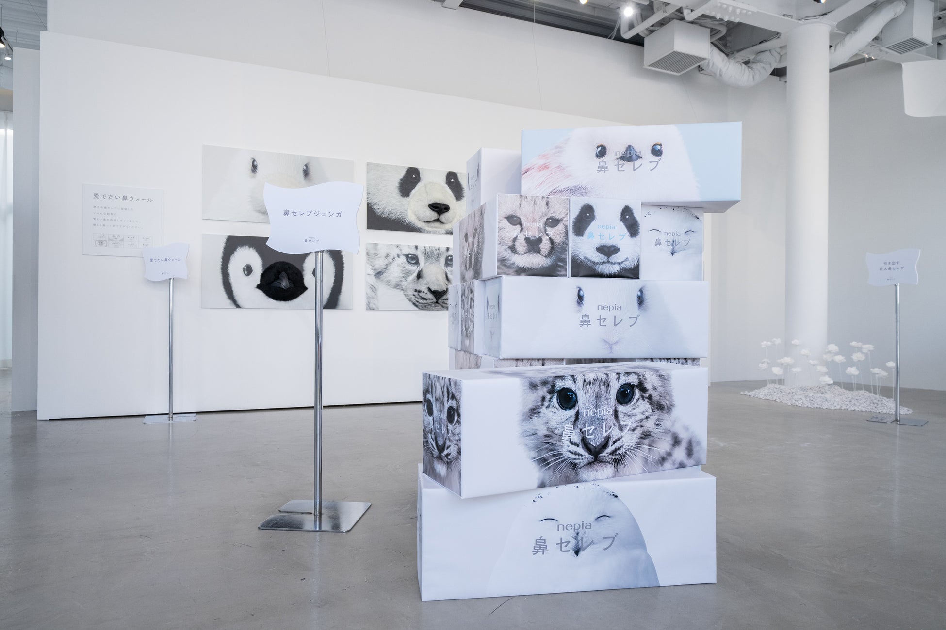 ティシュに見立てた大きな布を全身で引っ張る体験ができる「引き出す巨大鼻セレブ」や、歴代パッケージの動物たちの実際の鼻の質感に触れることができる「愛でたい鼻ウォール」、 鼻セレブティシュをイメージしたオリジナルドリンクが飲める「カフェ鼻セレブ」(※数量限定)、歴代パッケージでできた遊べる「鼻セレブジェンガ」をはじめ、スケールの大きな鼻セレブの世界に飛び込み、あらゆる体験を楽しむことできる、鼻セレブのこれまでの20年とこれからの未来のカタチを詰め込んだ初の空間となっています。