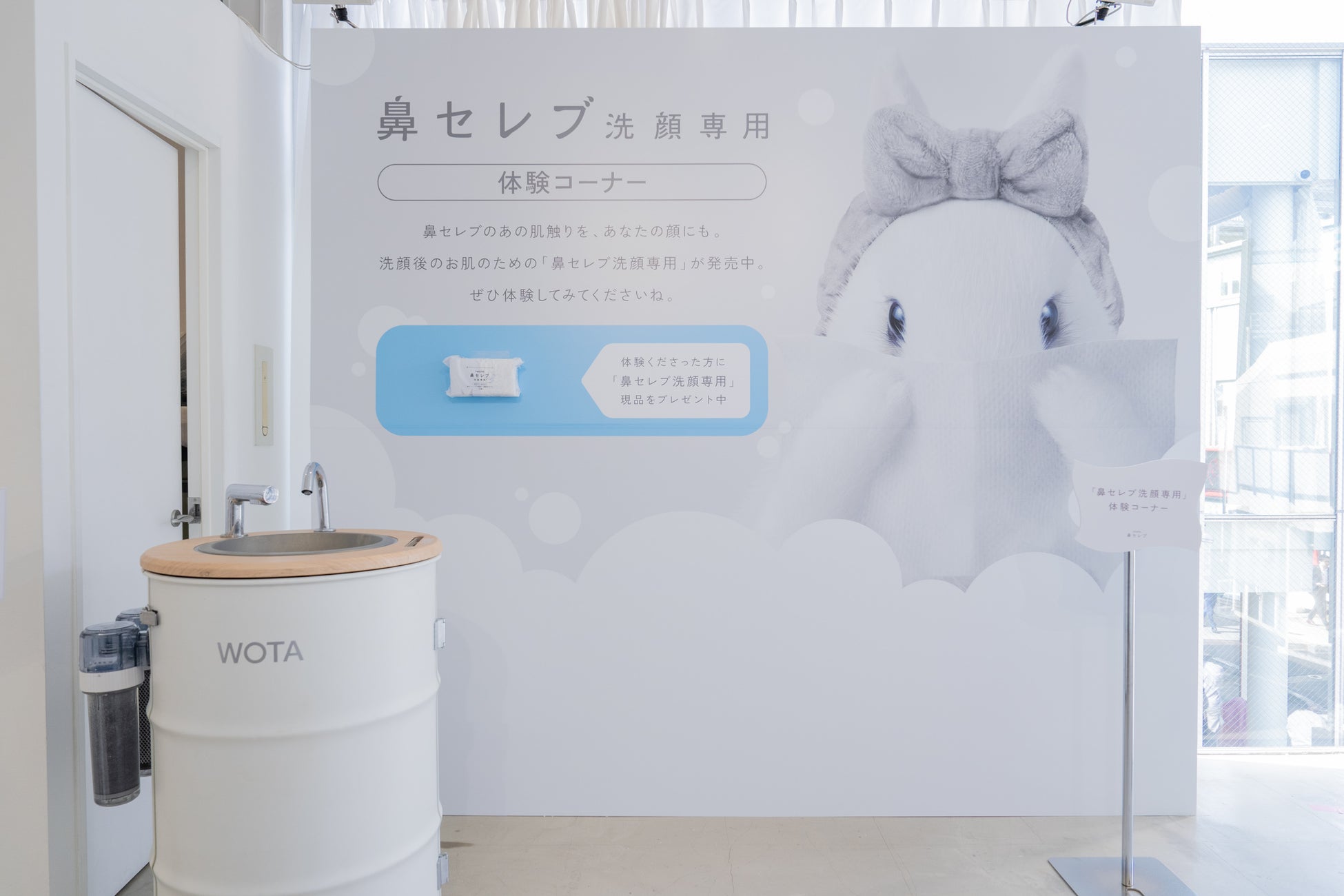 洗顔後に使用する「鼻セレブ洗顔専用」を体験できるコーナー。実際に手を洗って、その肌触りを体験していただいた方には、「鼻セレブ洗顔専用」の現品プレゼントも!