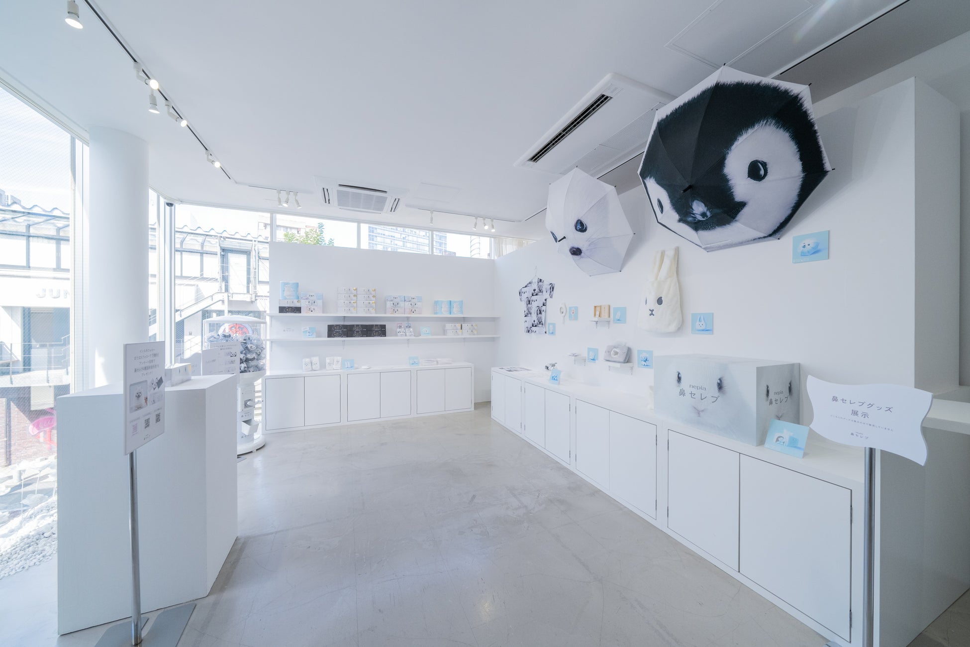 『愛でたい鼻展』限定デザインの20周年記念ボックスティシュに加え、もこもこの靴下やステッカーなどのオリジナルグッズを販売。