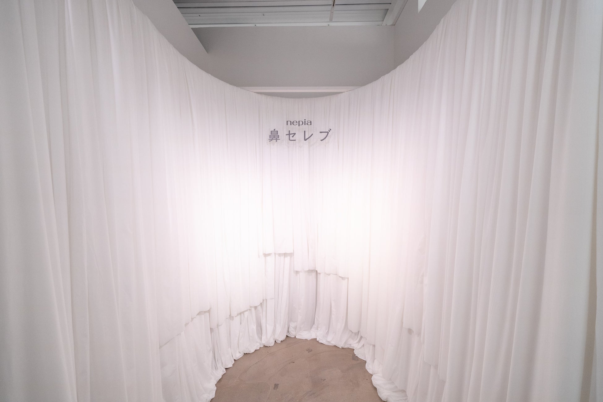 巨大ティシュがカーテンのように吊り下げられた真っ白な空間のフォトブース。鼻セレブのやわらかく、保湿力たっぷりの世界に飛び込める!?