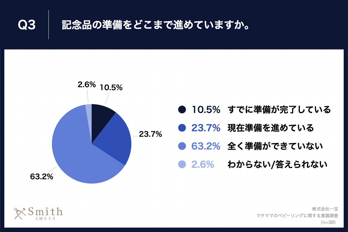 Q1で「非常にそう思う」「ややそう思う」と回答した方に、「Q3.記念品の準備をどこまで進めていますか。」(n=38)と質問したところ、「すでに準備が完了している」が10.5%、「現在準備を進めている」が23.7%、「全く準備ができていない」が63.2%という回答となりました。