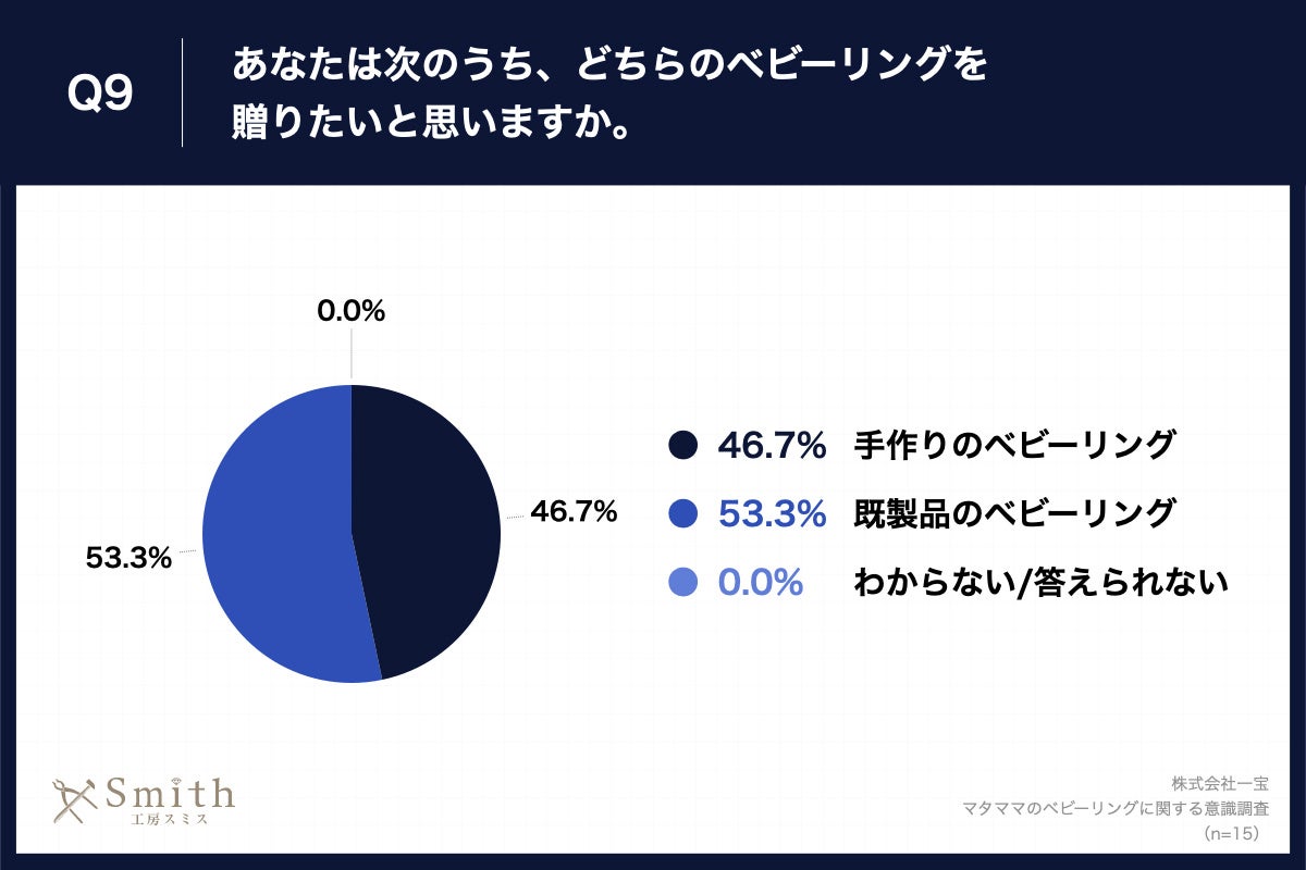 Q6で「かなり興味がある」「やや興味がある」と回答した方に、「Q9.あなたは次のうち、どちらのベビーリングを贈りたいと思いますか。」(n=15)と質問したところ、「手作りのベビーリング」が46.7%、「既製品のベビーリング」が53.3%という回答となりました。