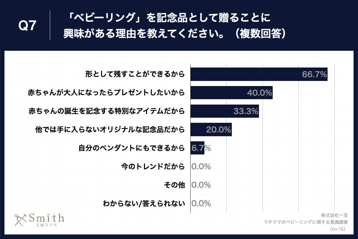 Q6で「かなり興味がある」「やや興味がある」と回答した方に、「Q7.「ベビーリング」を記念品として贈ることに興味がある理由を教えてください。(複数回答)」(n=15)と質問したところ、「形として残すことができるから」が66.7%、「赤ちゃんが大人になったらプレゼントしたいから」が40.0%、「赤ちゃんの誕生を記念する特別なアイテムだから」が33.3%という回答となりました。