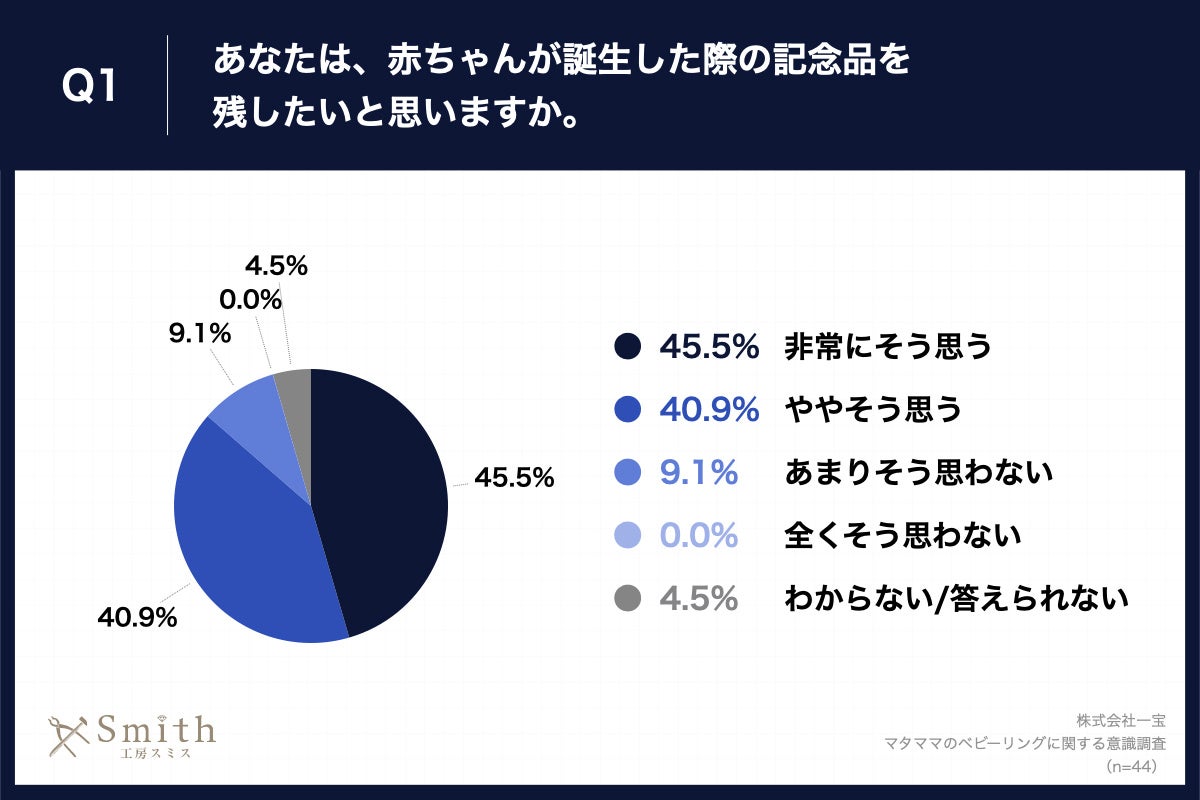 「Q1.あなたは、赤ちゃんが誕生した際の記念品を残したいと思いますか。」(n=44)と質問したところ、「非常にそう思う」が45.5%、「ややそう思う」が40.9%という回答となりました。