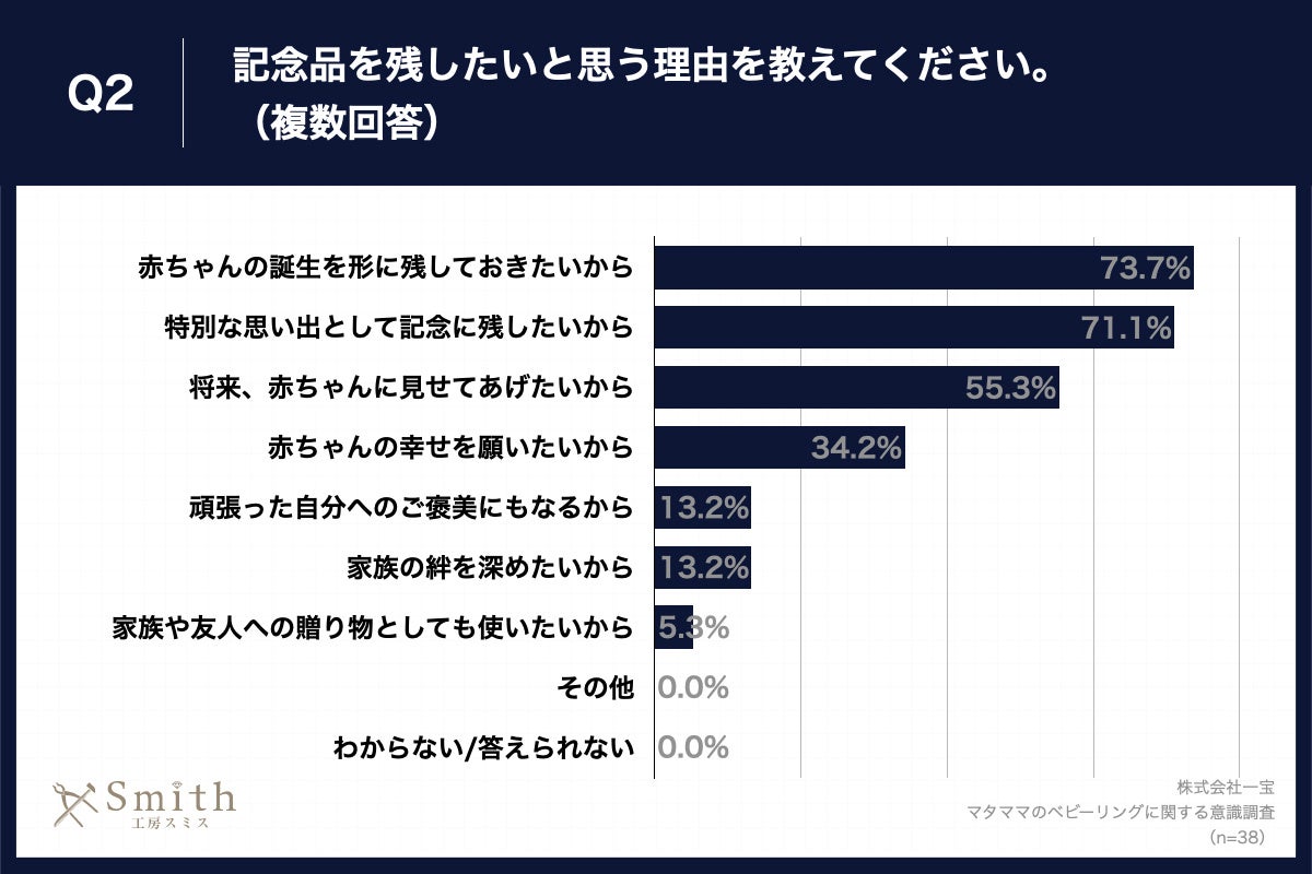 Q1で「非常にそう思う」「ややそう思う」と回答した方に、「Q2.記念品を残したいと思う理由を教えてください。(複数回答)」(n=38)と質問したところ、「赤ちゃんの誕生を形に残しておきたいから」が73.7%、「特別な思い出として記念に残したいから」が71.1%、「将来、赤ちゃんに見せてあげたいから」が55.3%という回答となりました。