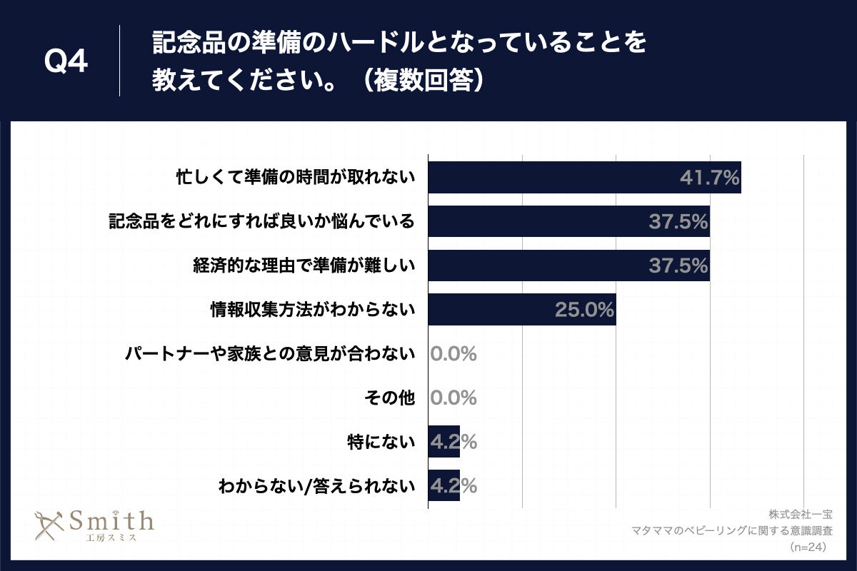 Q3で「全く準備ができていない」と回答した方に、「Q4.記念品の準備のハードルとなっていることを教えてください。(複数回答)」(n=24)と質問したところ、「忙しくて準備の時間が取れない」が41.7%、「記念品をどれにすれば良いか悩んでいる」が37.5%、「経済的な理由で準備が難しい」が37.5%という回答となりました。