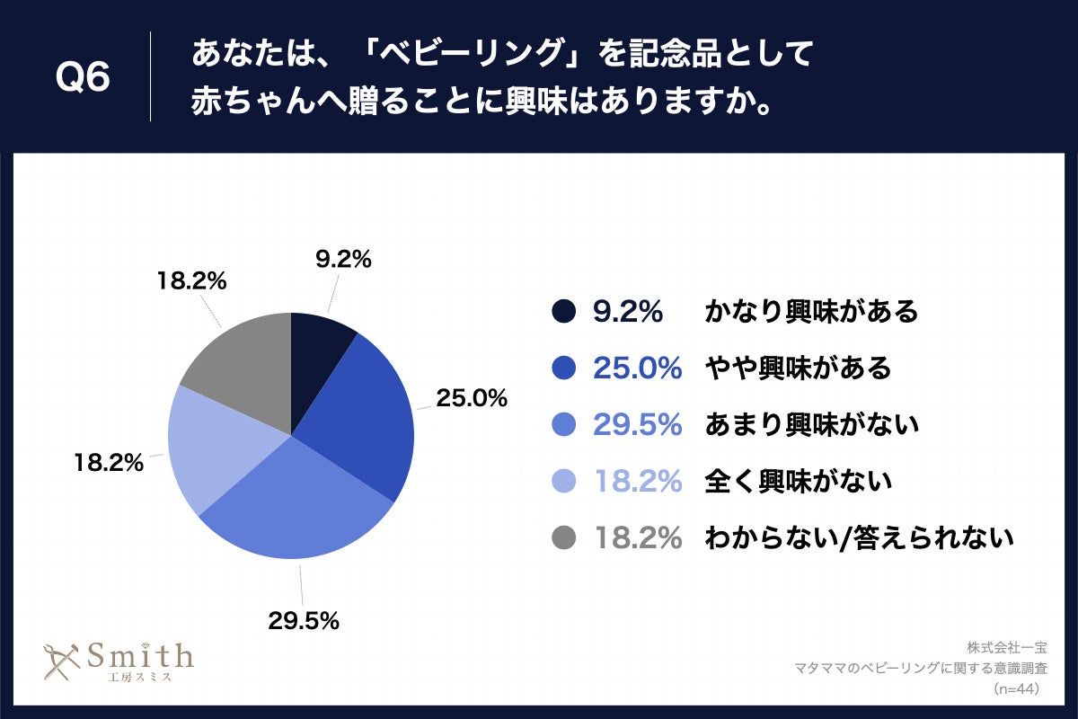 「Q6.あなたは、「ベビーリング」を記念品として赤ちゃんへ贈ることに興味はありますか。」(n=44)と質問したところ、「かなり興味がある」が9.2%、「やや興味がある」が25.0%という回答となりました。