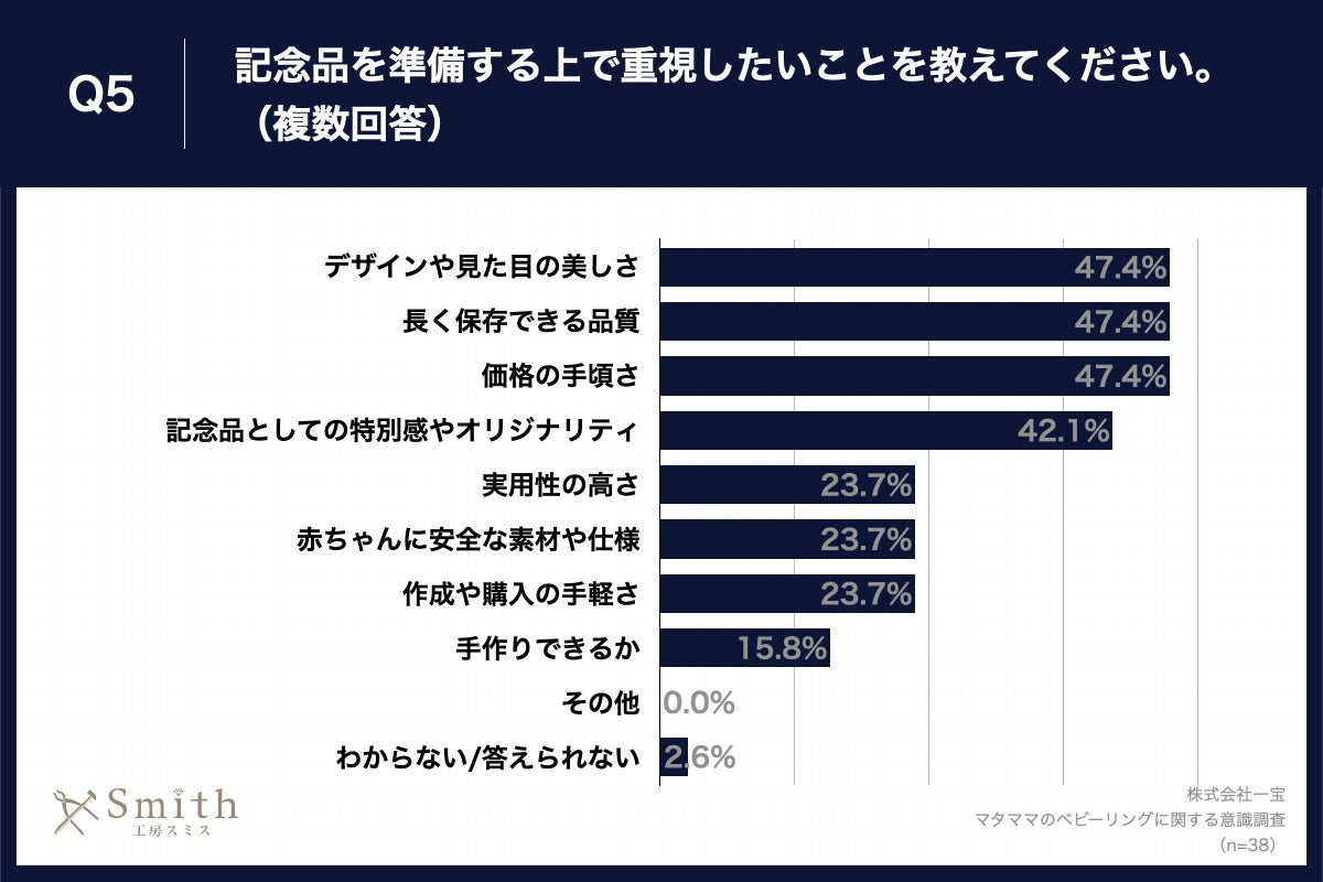 Q1で「非常にそう思う」「ややそう思う」と回答した方に、「Q5.記念品を準備する上で重視したいことを教えてください。(複数回答)」(n=38)と質問したところ、「デザインや見た目の美しさ」が47.4%、「長く保存できる品質」が47.4%、「価格の手頃さ」が47.4%という回答となりました。