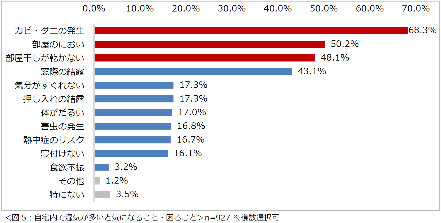 「自宅内で湿気が多いと気になること・困ることは何ですか?」という問いには、約7割が「カビ・ダニの発生」と回答したほか、「部屋のにおい」や「部屋干しが乾かない」と答えた人も約半数にのぼりました(図5)。