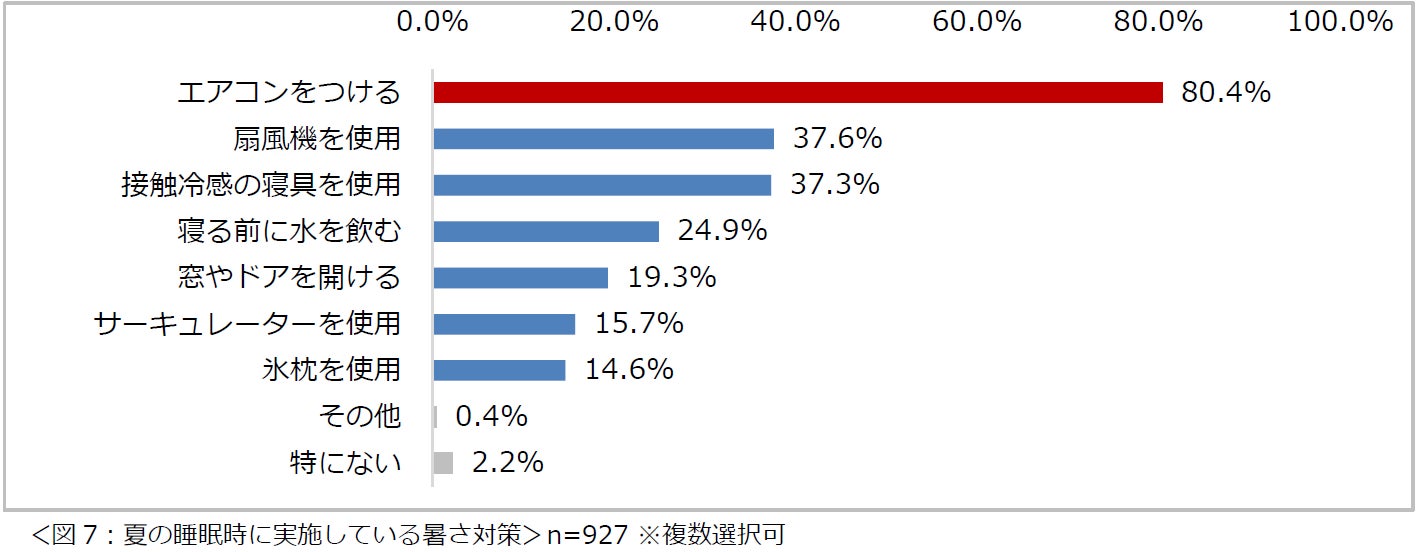 また、「睡眠時に実施している暑さ対策」について答えてもらったところ、8割以上の人が「エアコンをつける」と回答しています(図7)。