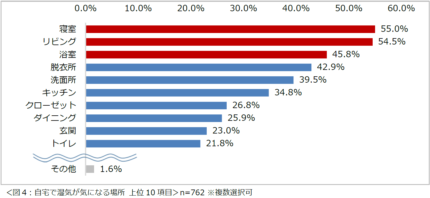 さらに、夏場に自宅内の湿気が気になると回答した762名に、「湿気が気になる場所」について尋ねると、1位は「寝室」(55.0%)、2位は「リビング」(54.5%)、3位は「浴室」(45.8%)でした。また、「浴室」につづき、「脱衣所」(42.9%)、「洗面所」(39.5%)、「キッチン」(34.8%)といった水回りも上位にランクインしています(図4)。