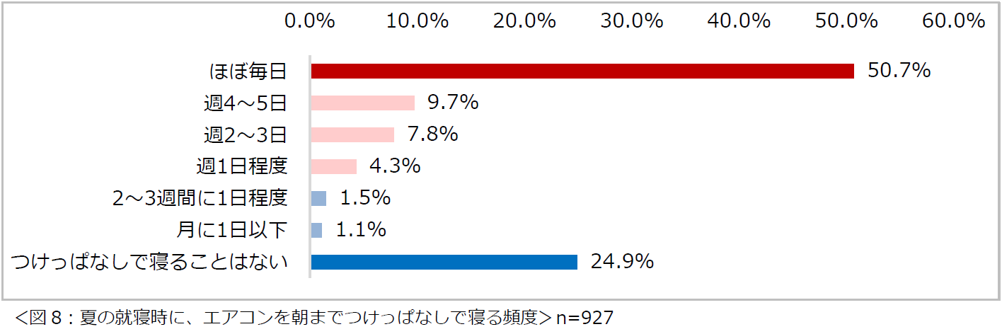 「夏の就寝時に、エアコンを朝までつけっぱなしで寝る頻度」について尋ねたところ、「ほぼ毎日」という人が約半数という結果になりました。一方、「つけっぱなしで寝ることはない」という人も2割以上いることが分かりました(図8)。
